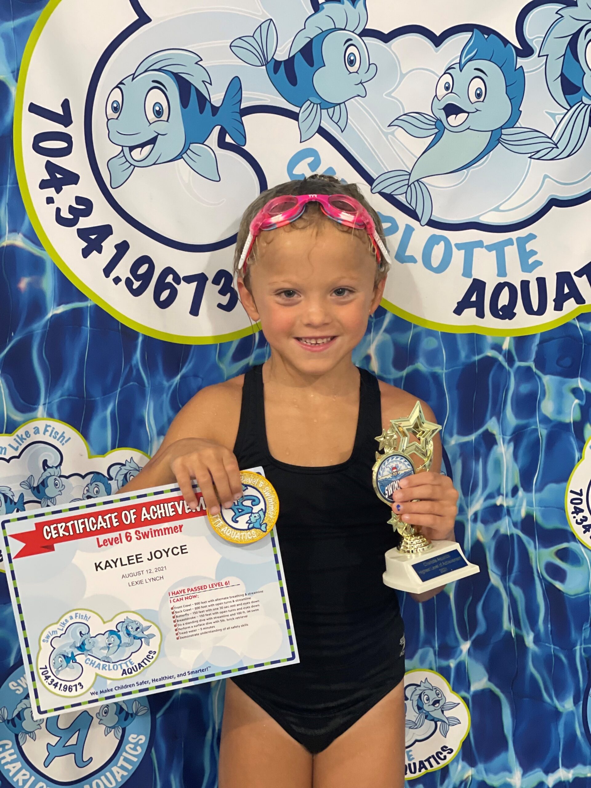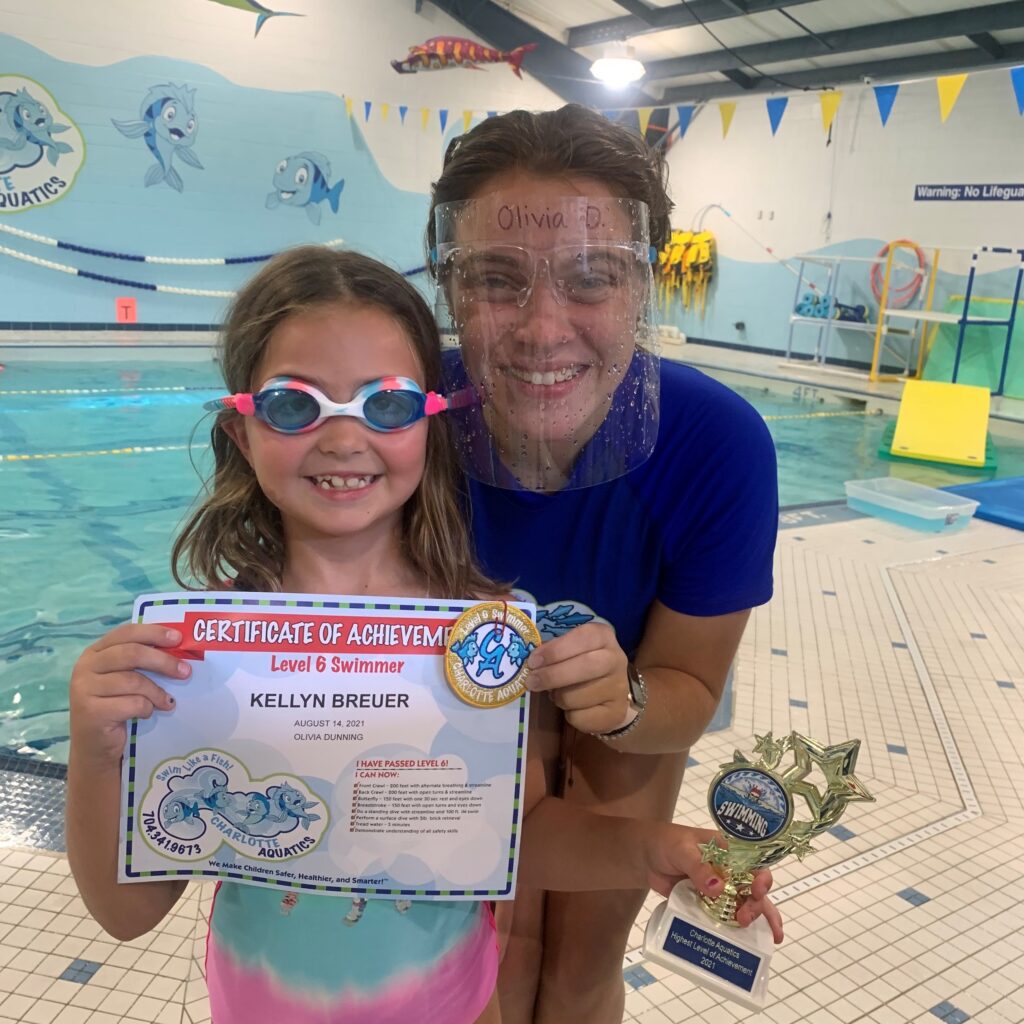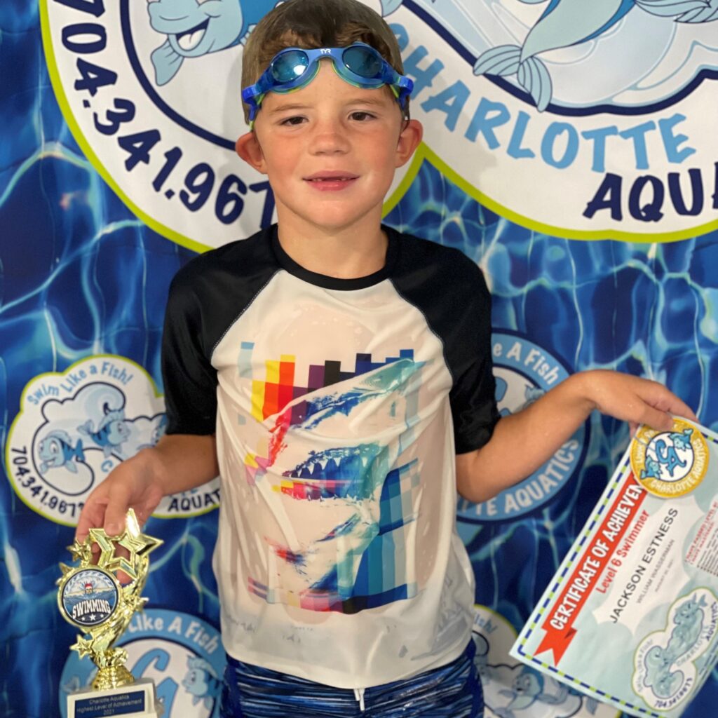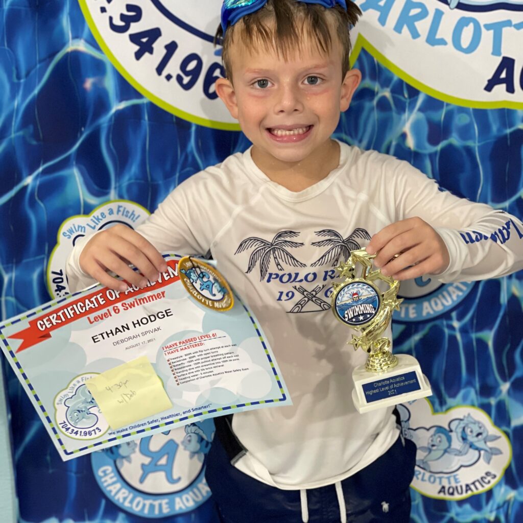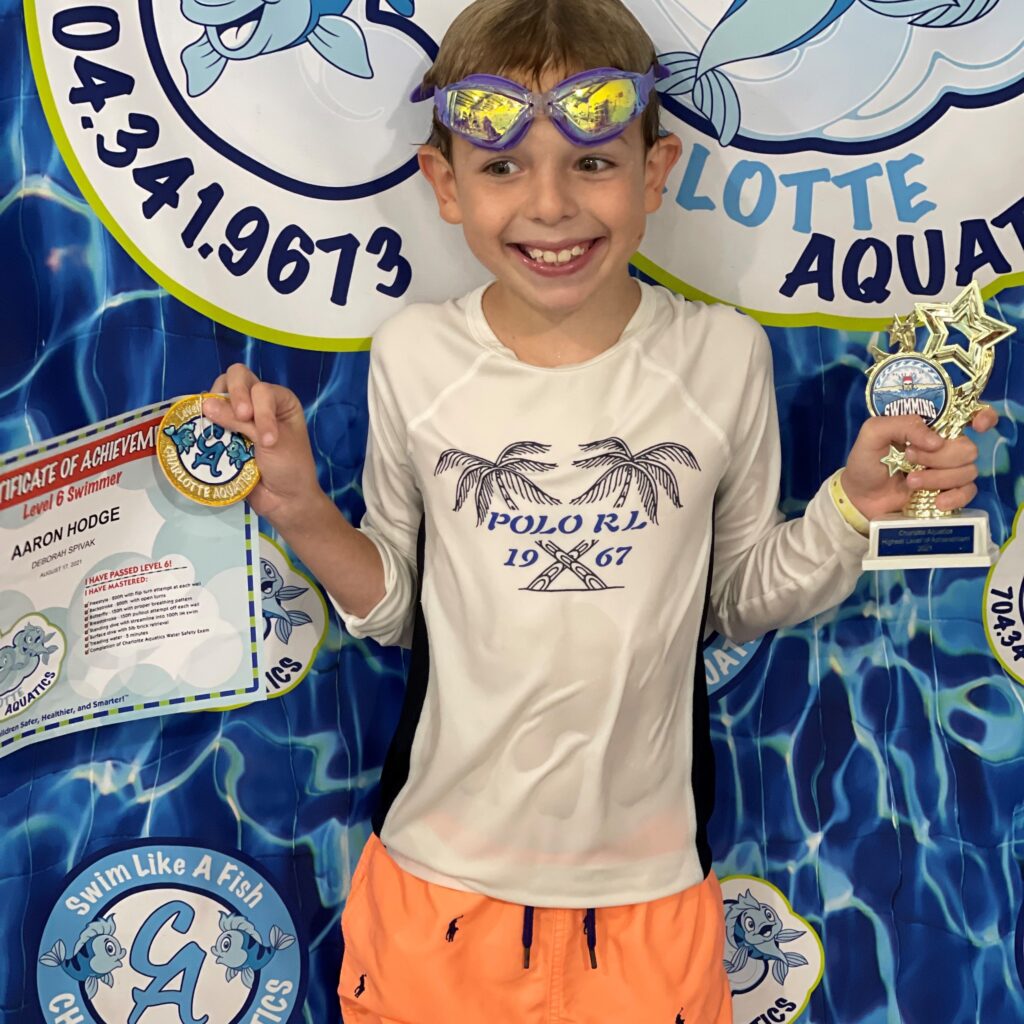 Swimming allows me to stay activate and have fun. My best swimming memory is when I finally learned how to do my backstroke and not get water in my nose which can really hurt. I have saved all my patches and certificates in a bin which I plan to finally display in my room along with my trophy from passing the level 6 swim class. My favorite stroke is the breaststroke because I love the way I glide in the water. Swimming has changed my life because it made me more confident about being around and getting in the water. It makes me and my parents happing knowing I can swim and be safe, thanks to Charlotte Aquatics. What I love most about Charlotte Aquatics are all the wonderful and talented swim teachers who helped me to get to this final level 6. My favorite memory of Charlotte Aquatics is when I was practicing my breaststroke arms. I had to sit on a noddle in the water in a relay race. The noodle caused me to flip over and fall in the water. I kept falling off but I finally got the hang of it and made it to the end of the pool.
