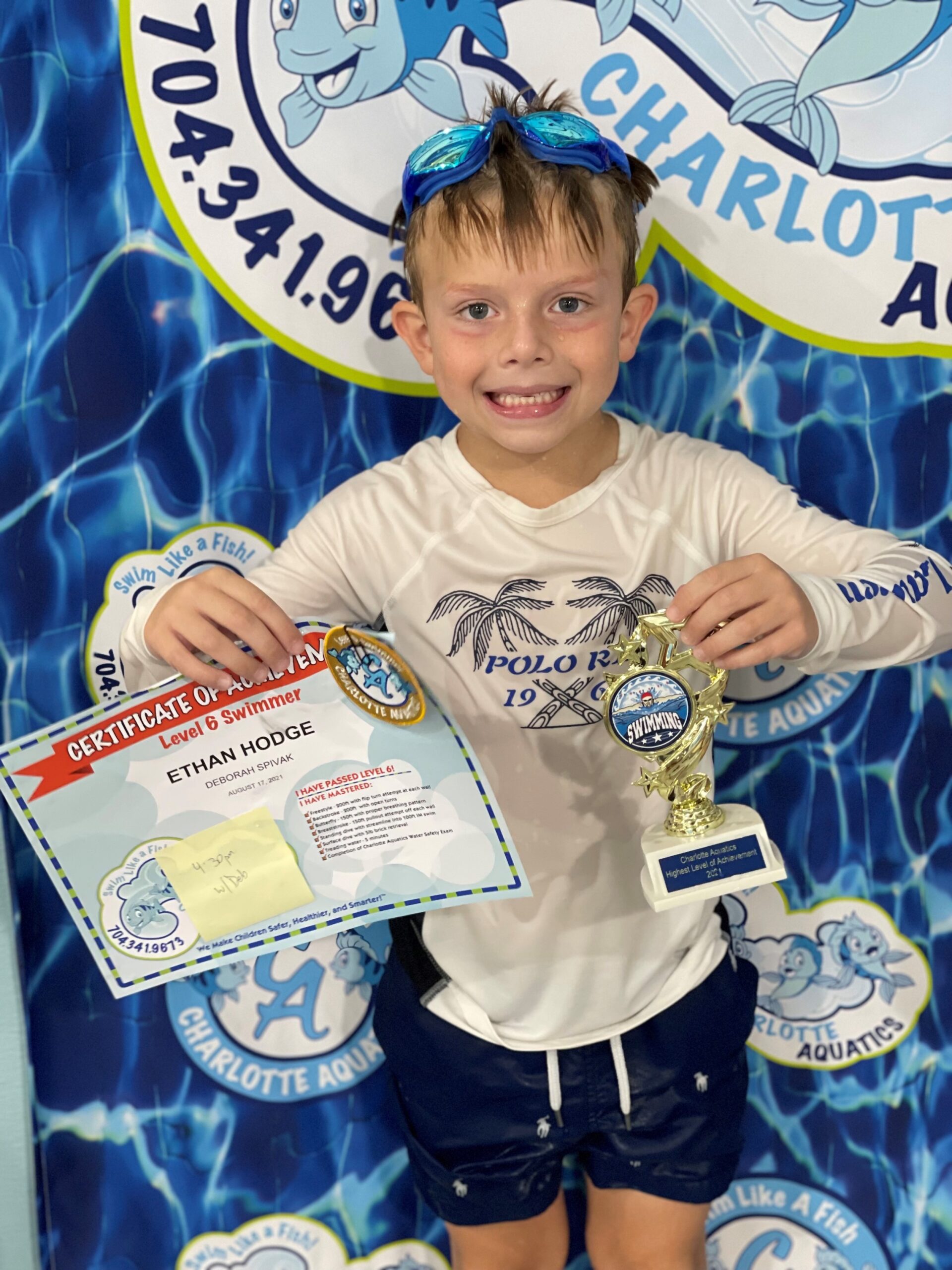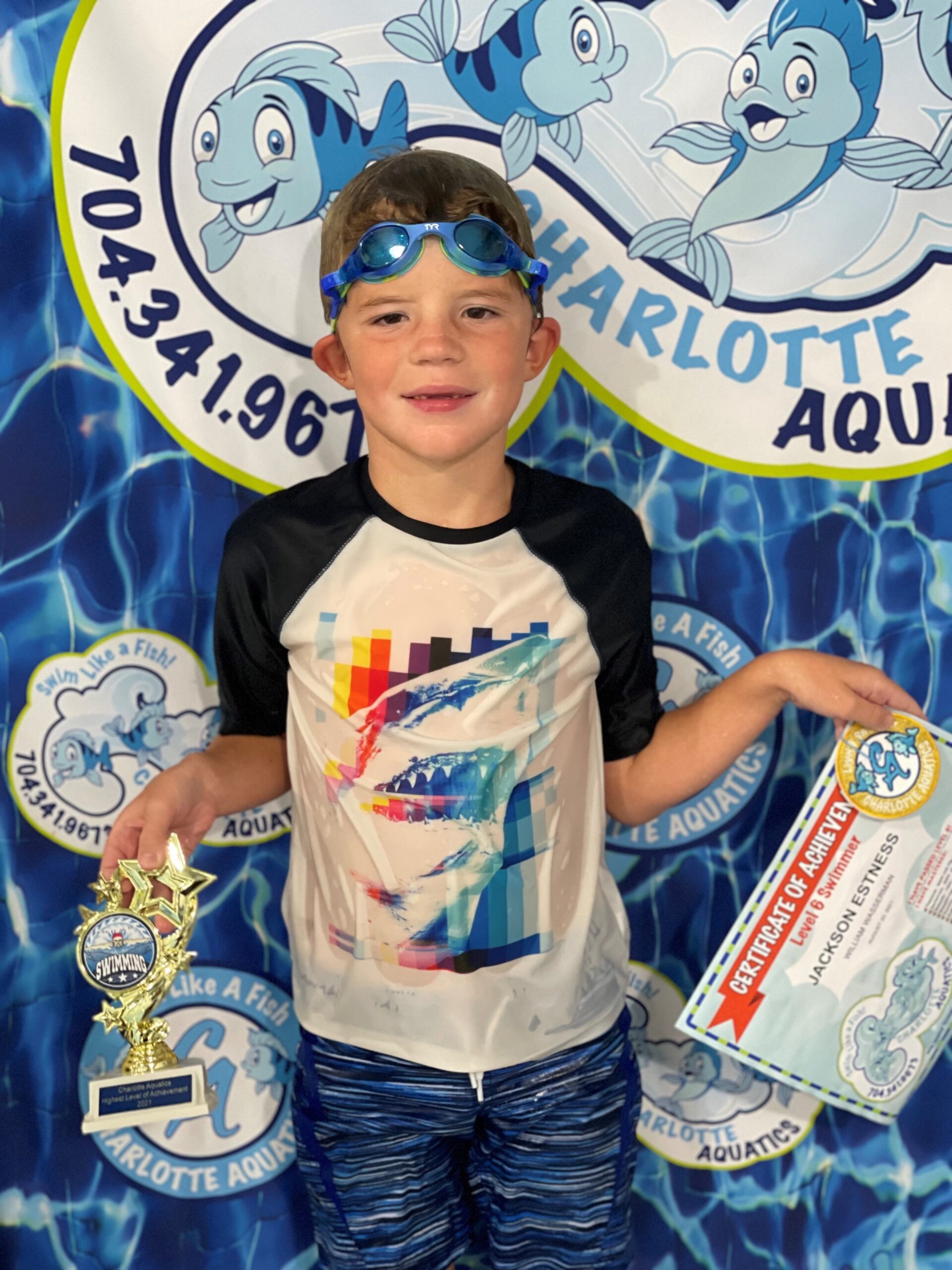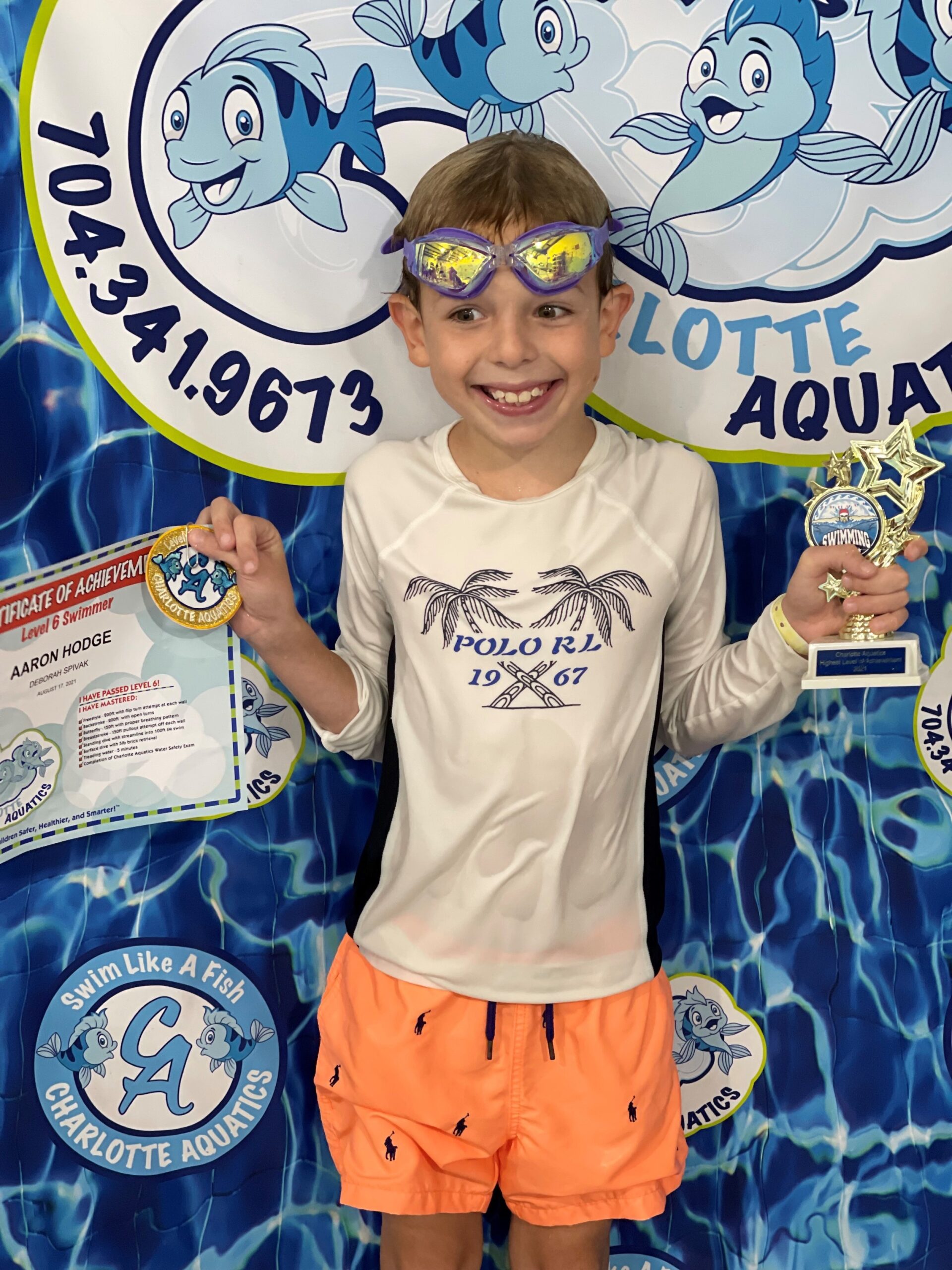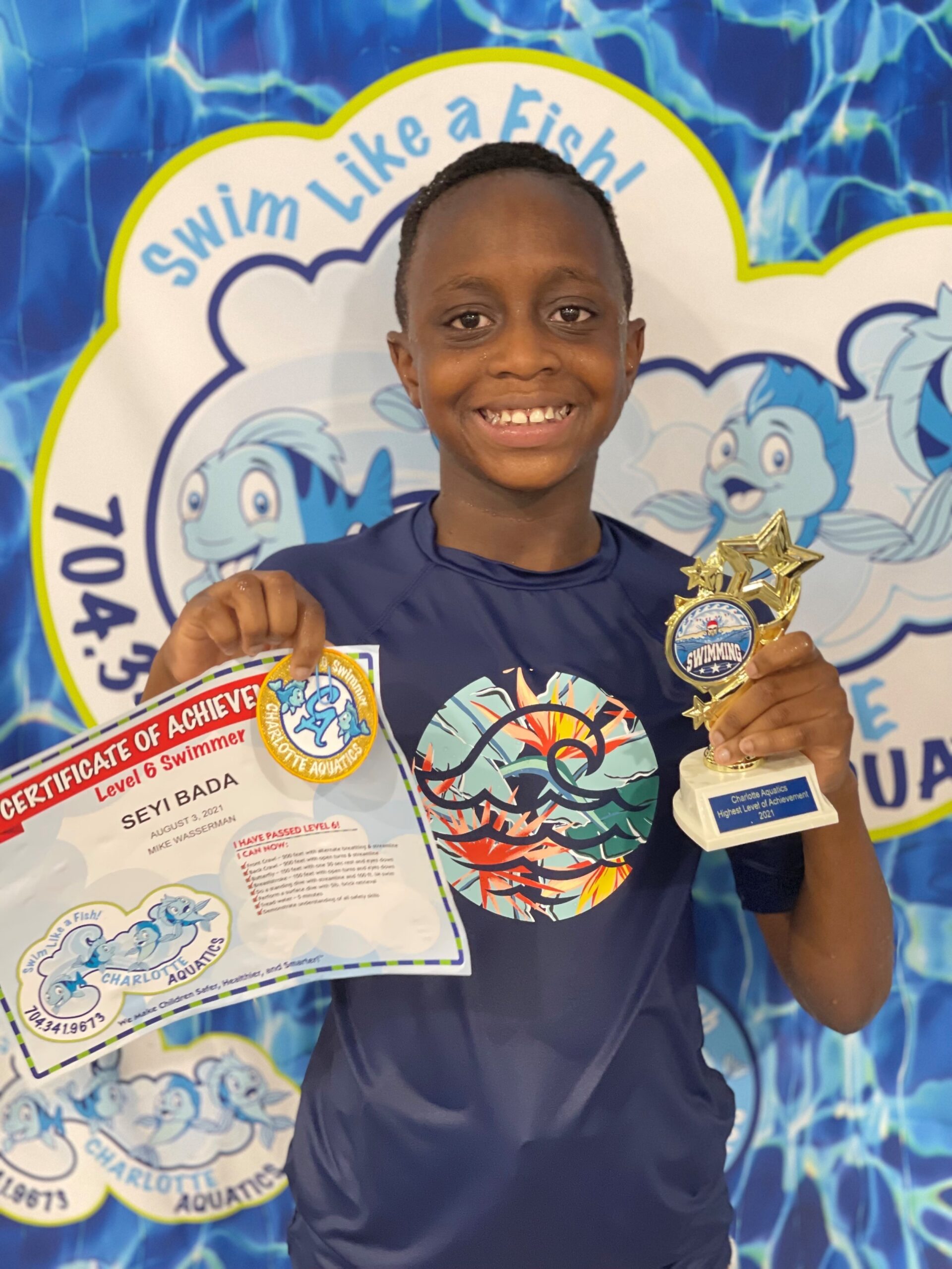 Swimming allows me to stay activate and have fun. My best swimming memory is when I finally learned how to do my backstroke and not get water in my nose which can really hurt. I have saved all my patches and certificates in a bin which I plan to finally display in my room along with my trophy from passing the level 6 swim class. My favorite stroke is the breaststroke because I love the way I glide in the water. Swimming has changed my life because it made me more confident about being around and getting in the water. It makes me and my parents happing knowing I can swim and be safe, thanks to Charlotte Aquatics. What I love most about Charlotte Aquatics are all the wonderful and talented swim teachers who helped me to get to this final level 6. My favorite memory of Charlotte Aquatics is when I was practicing my breaststroke arms. I had to sit on a noddle in the water in a relay race. The noodle caused me to flip over and fall in the water. I kept falling off but I finally got the hang of it and made it to the end of the pool.