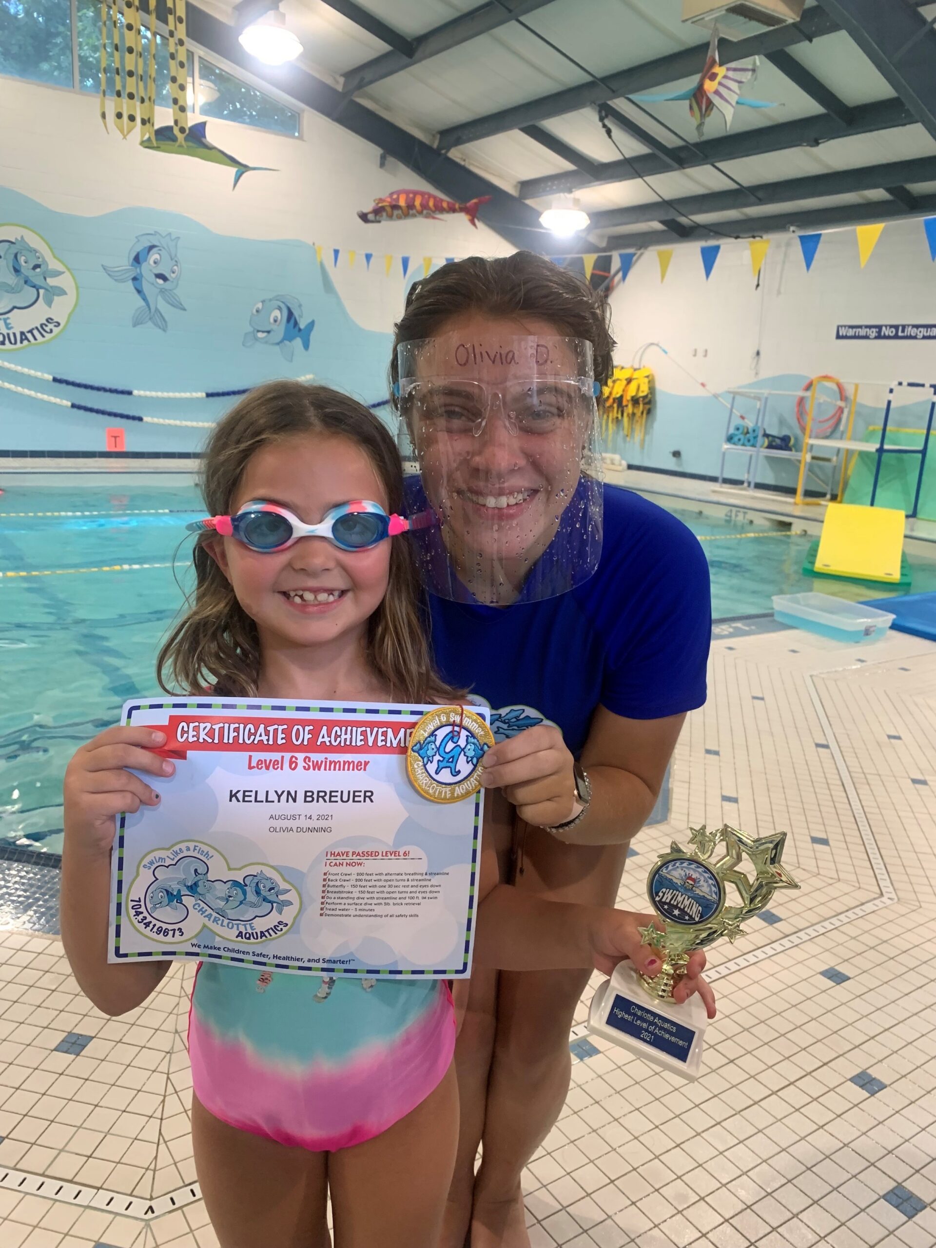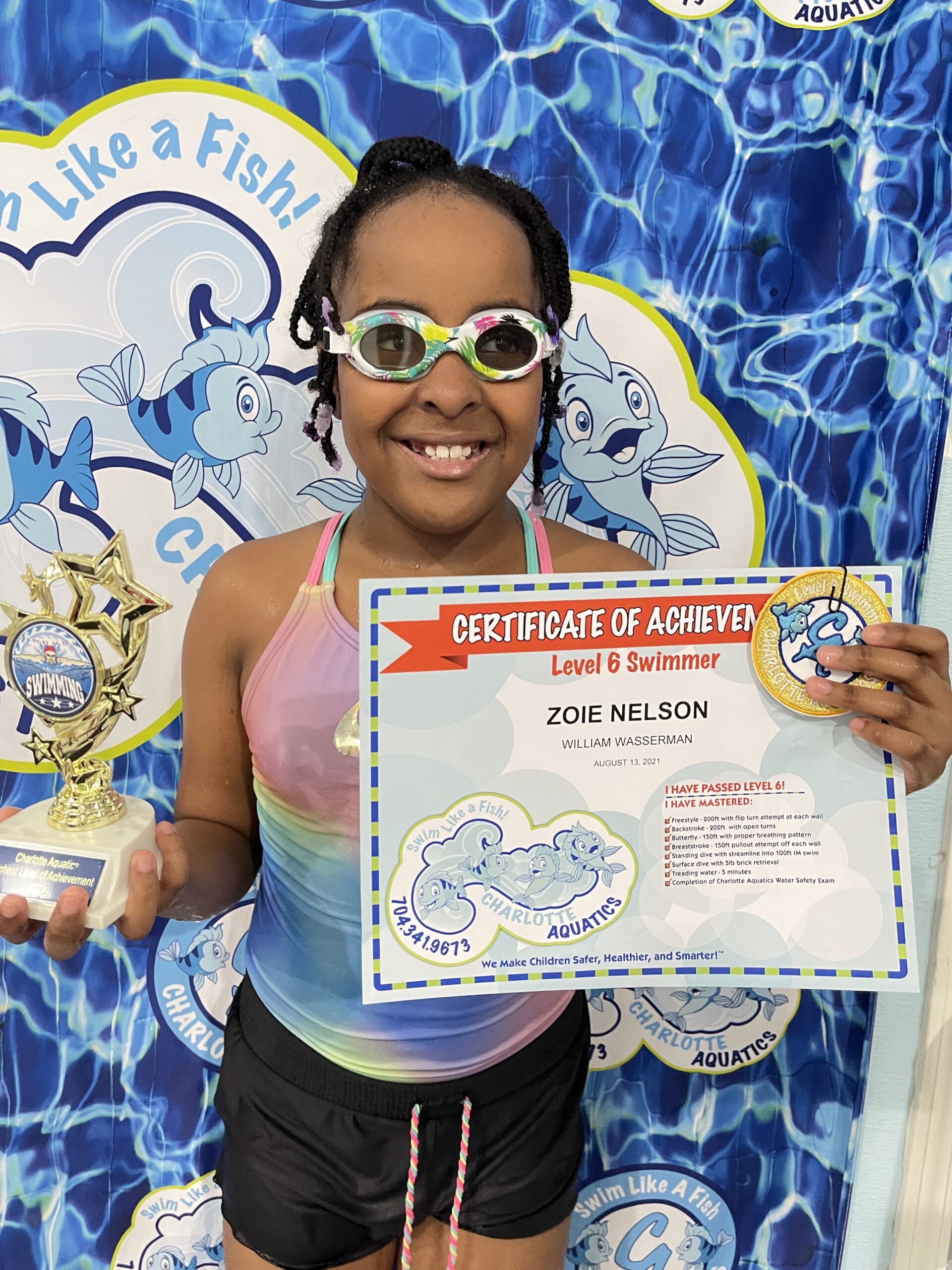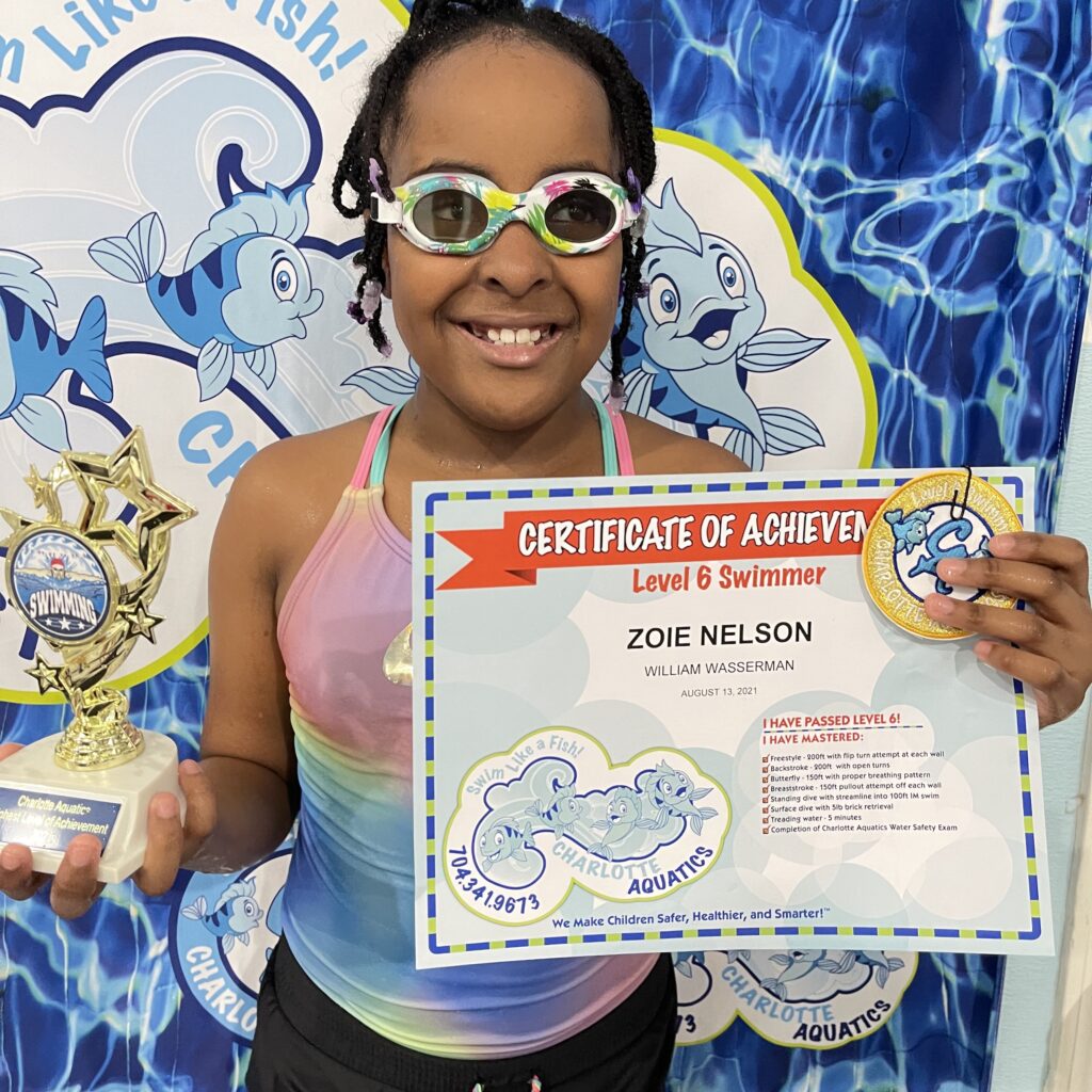 I just wanted to take the time to thank the entire past and present Charlotte Aquatics staff members who helped Zoie accomplish the goal of passing all swim levels, especially level 6! I witnessed all the hard work they put into teaching and encouraging her to reach her full potential. There were happy times and a few tears but they never gave up on her. The staff was so generous with their words of advice and video clips to help Zoie perfect her butterfly stroke and pass level 6.