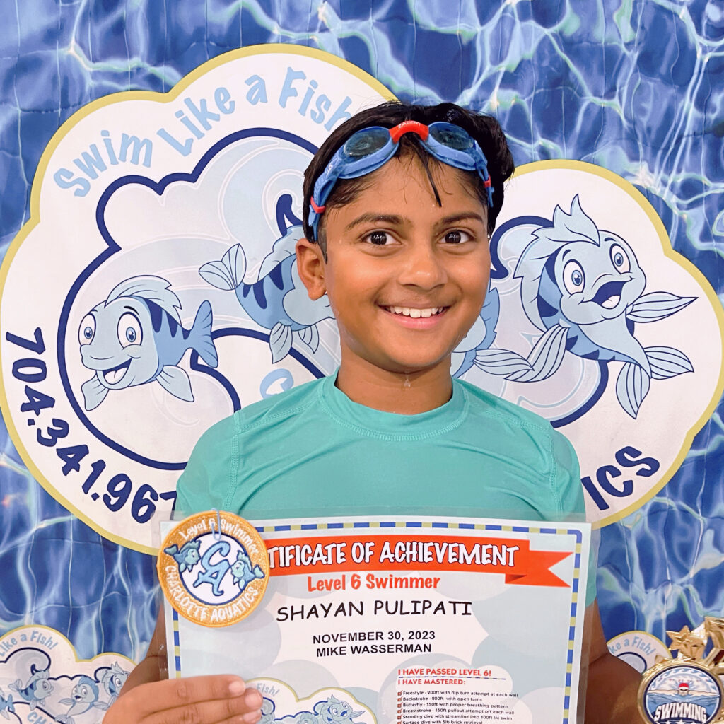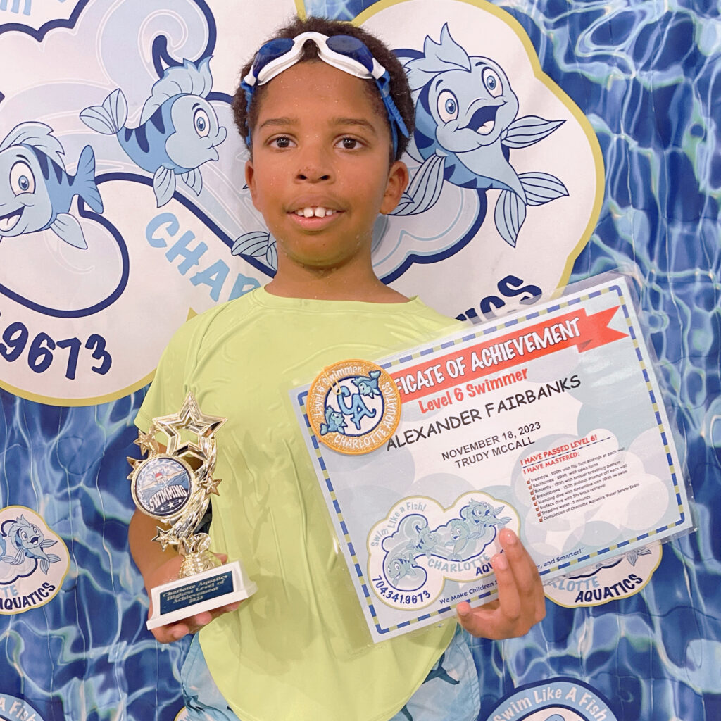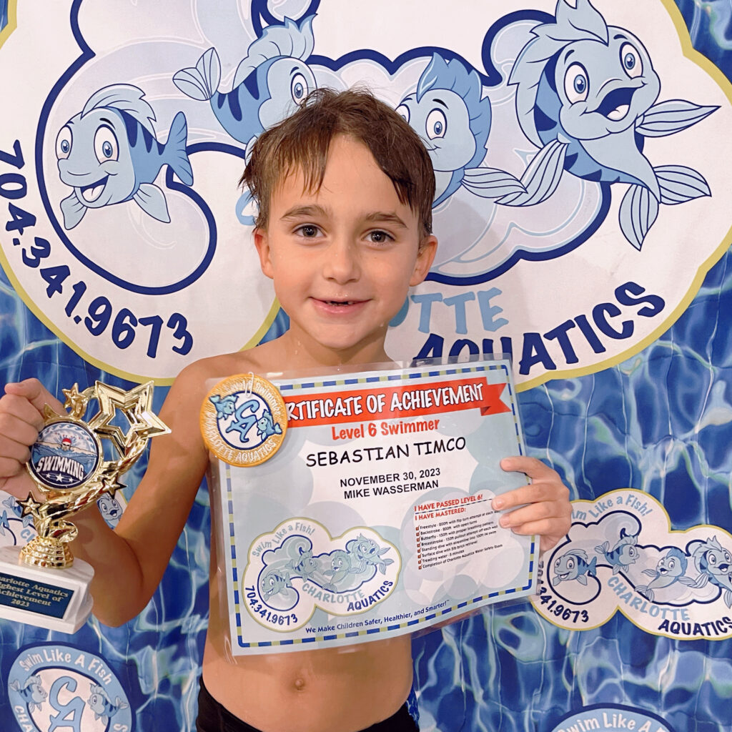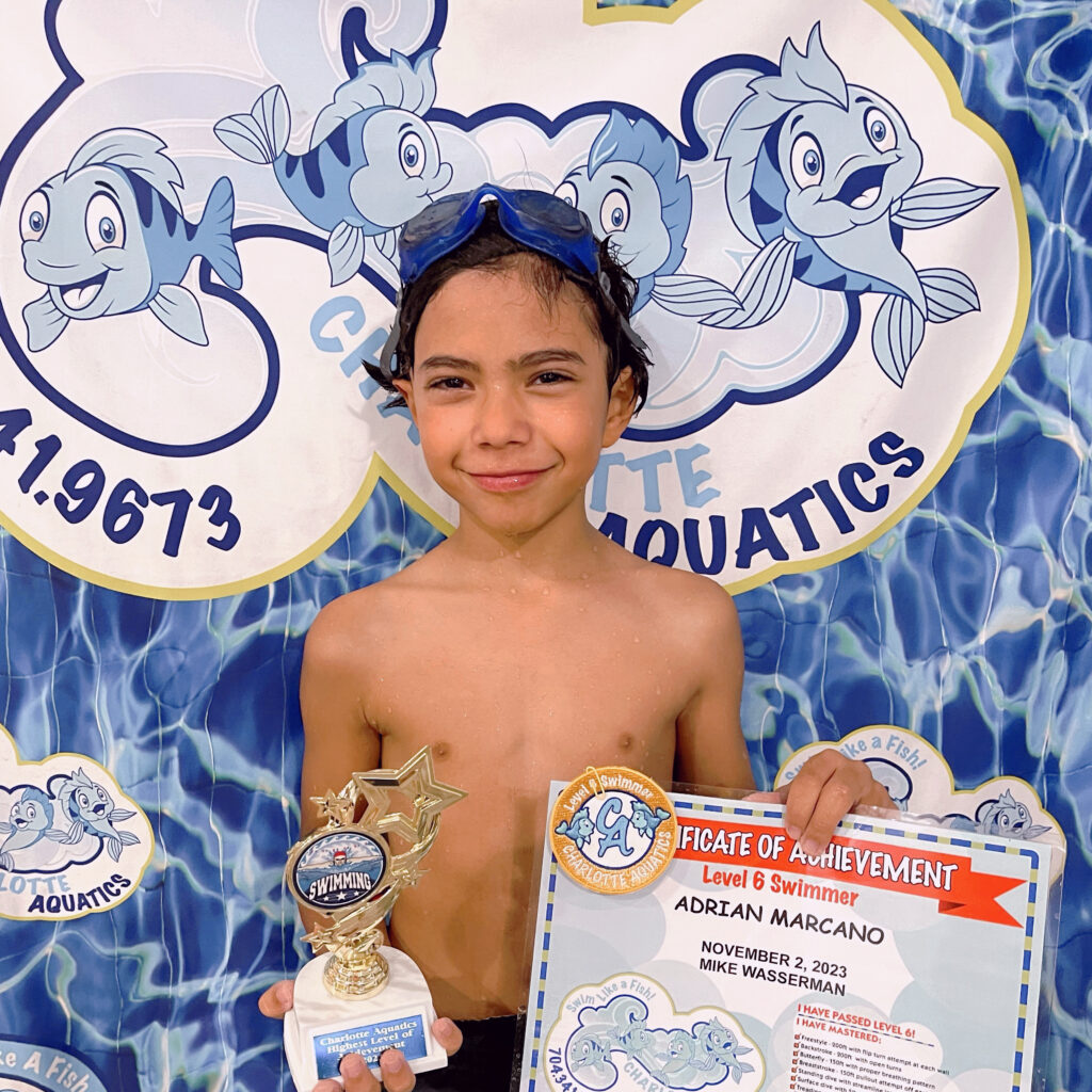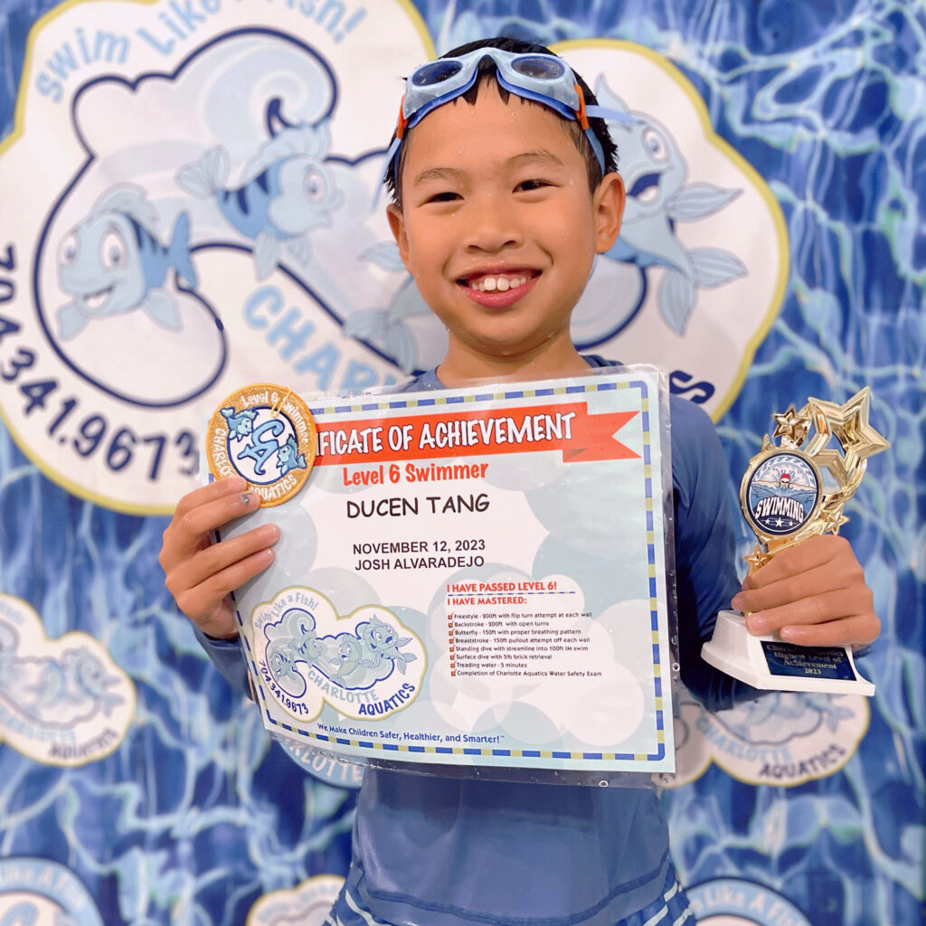 Hello, my name is Ducen, and I’m 9 years old. When I am not swimming, I like to play soccer. My favorite swimming memory is working with all of my teachers and swinging into the water with the rope. My favorite swim stroke is the butterfly. I’m glad I can now swim safely in the pool and at the beach. Thank you, Charlotte Aquatics, for teaching me the skills to be a strong swimmer!