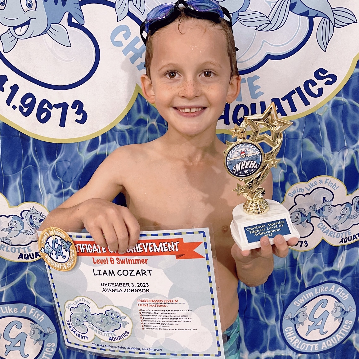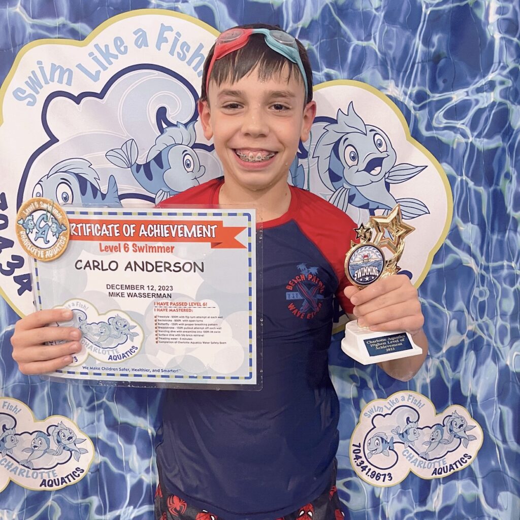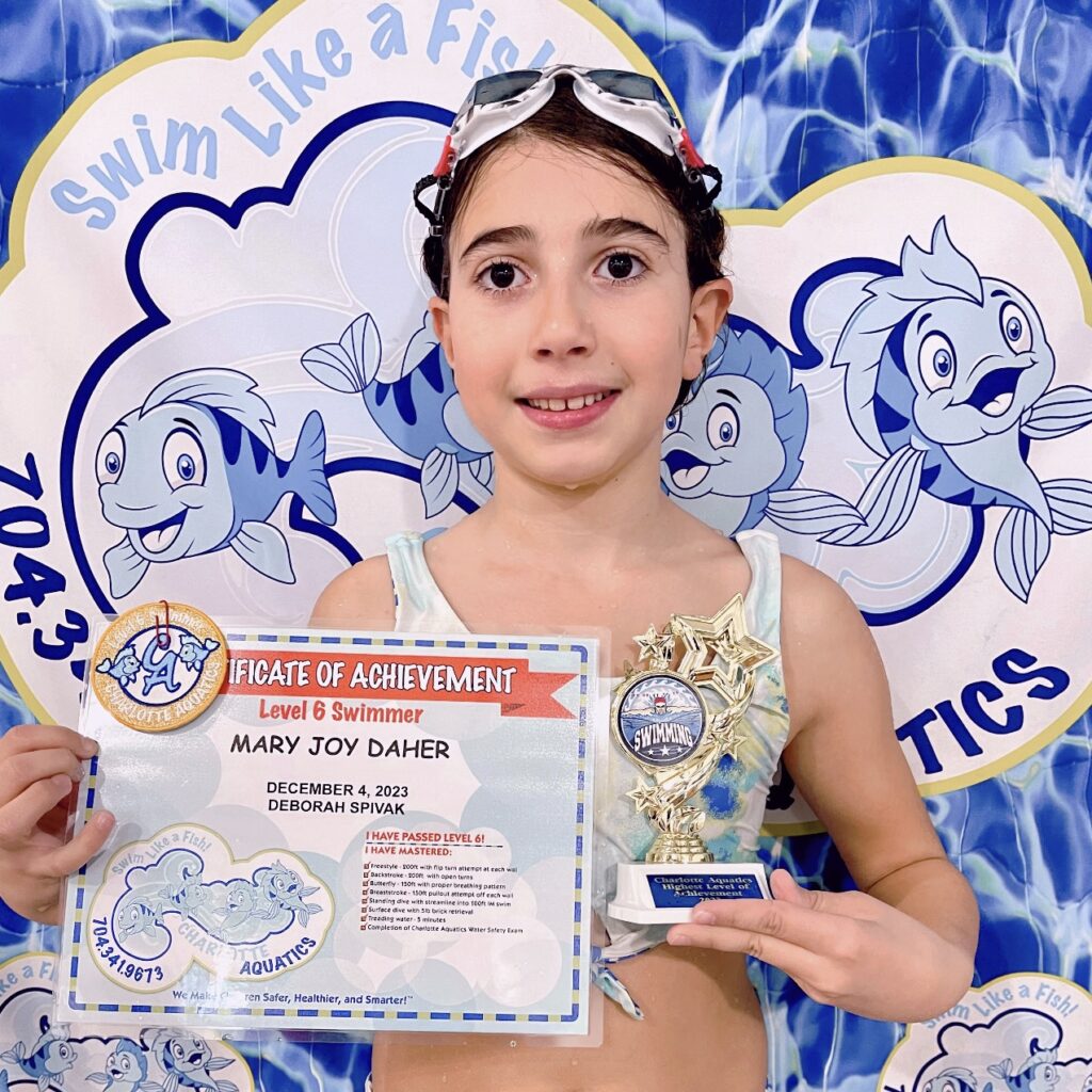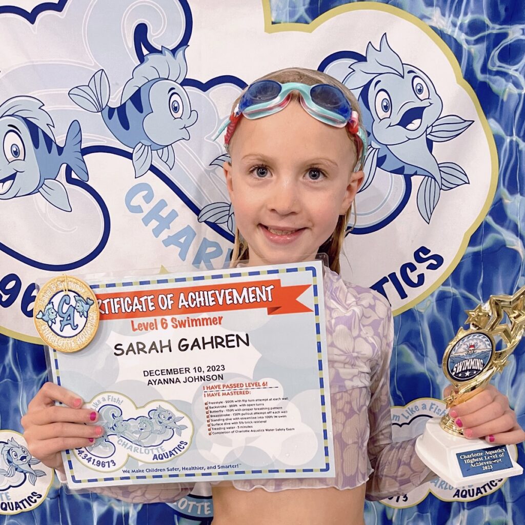 Sarah started with Charlotte Aquatics when she was 6 months old. 8 years later she is a strong swimmer who likes to goof off in the pool. She has had some many of the amazing teachers at Charlotte Aquatics! When we started we were with mommy and me, and by 18 months old, Sarah was pushing off and swimming to Ms Kathryn without even looking back. Charlotte Aquatics equals Confidence in the water. We have never had a fear of the water, because of these lessons we are comfortable taking our children to any location. Sarah’s favorite memory of swimming is the slide. She loved the foam one that floated in the middle of the pool. She also thinks that the canoe when she was little was incredible – Mr Will laughing as he’d push them across the pool and then capsize them. She remembers being one of the only kids in the pool during Covid when she was learning her crawl. Mr Devyn, Mr Will, Ms Katie, Ms Kathryn, Ms Megan AND Ms Lexi started to yell her name as she came close to finishing. She said it was so LOUD it made the water move and made her laugh. Her favorite stroke is the crawl, she says is the one that makes the most sense and moves the fastest. Thank you for our time at Charlotte Aquatics. The consistency of the staff and the joy they bring to swimming.