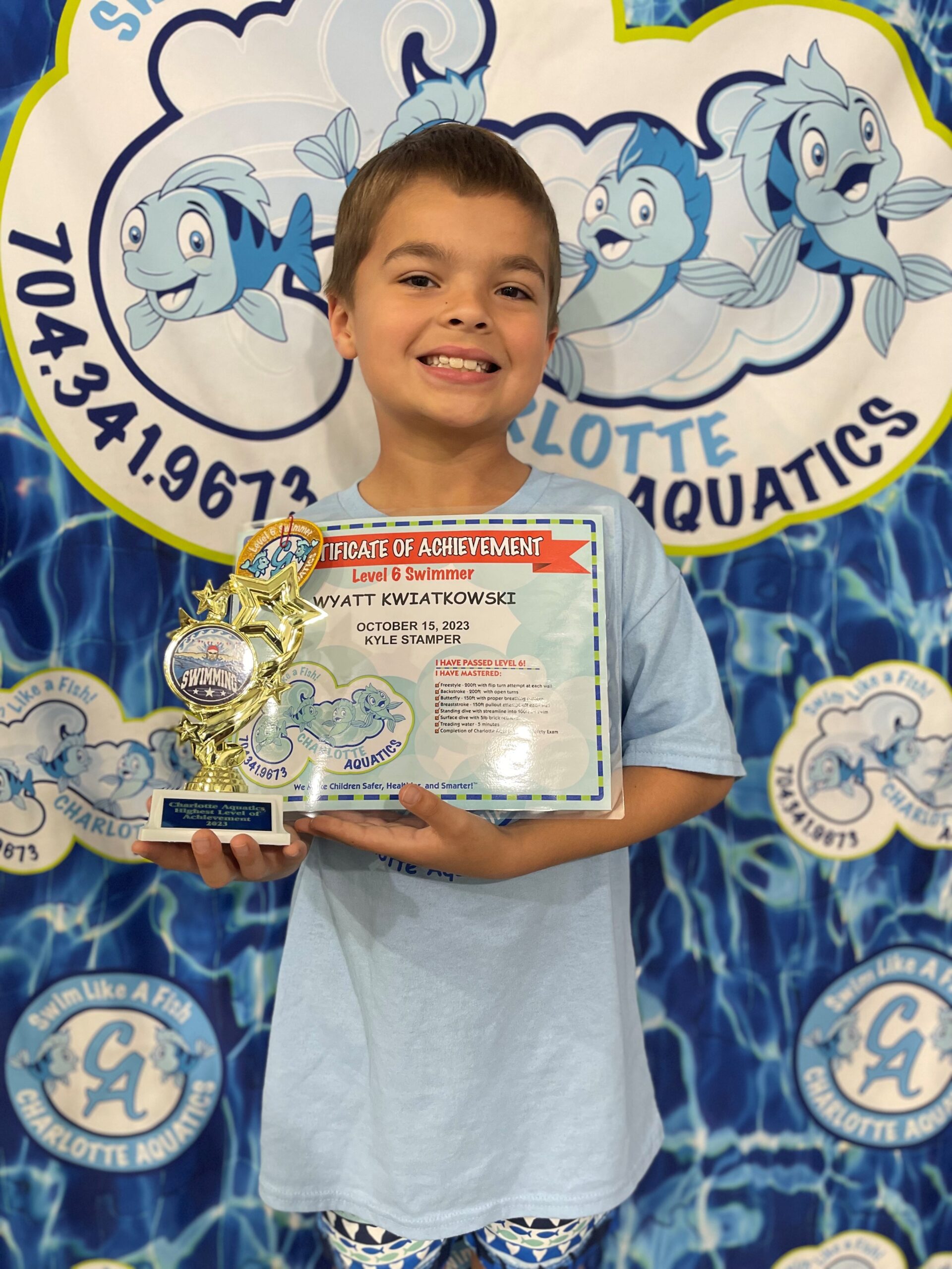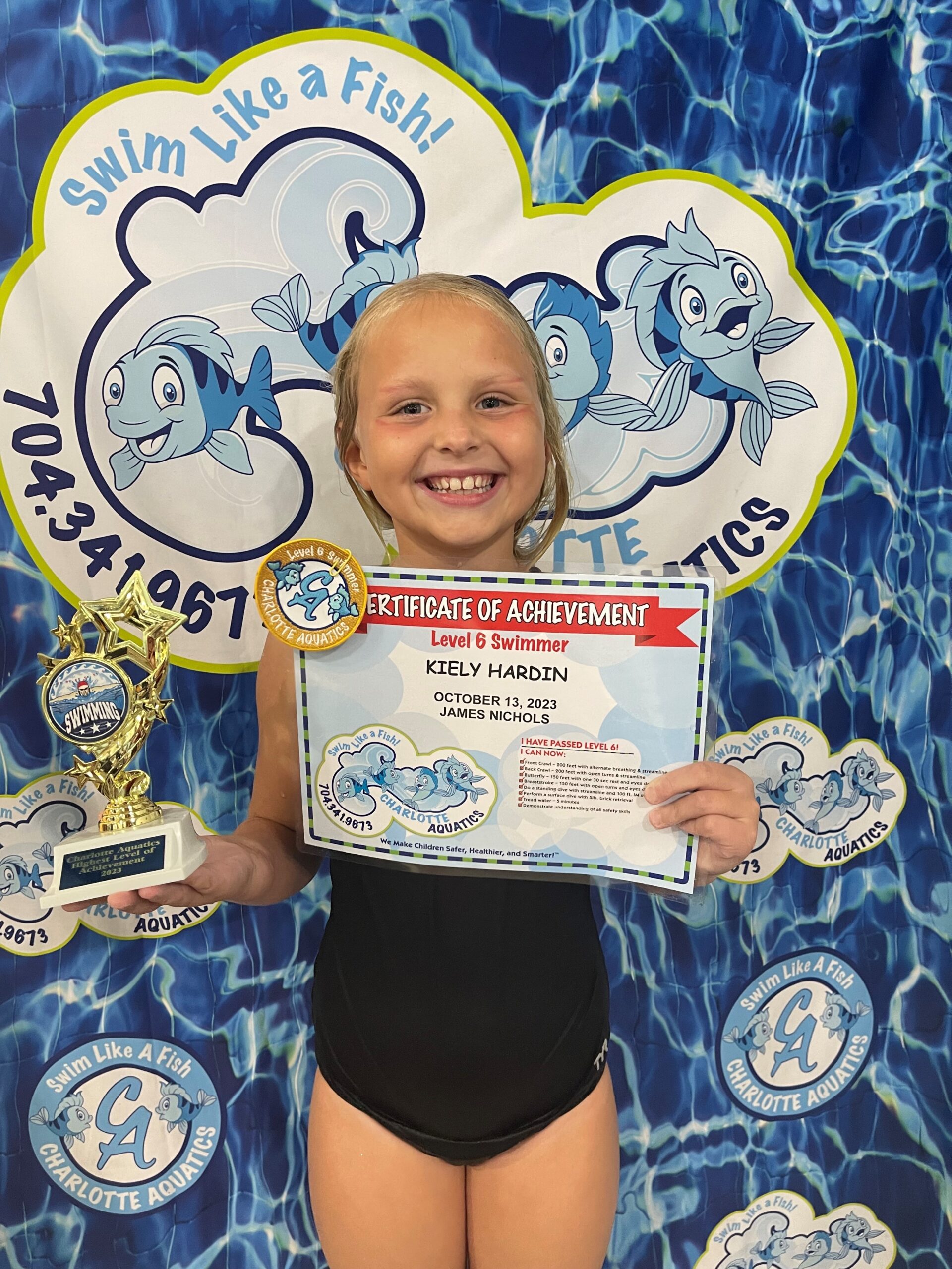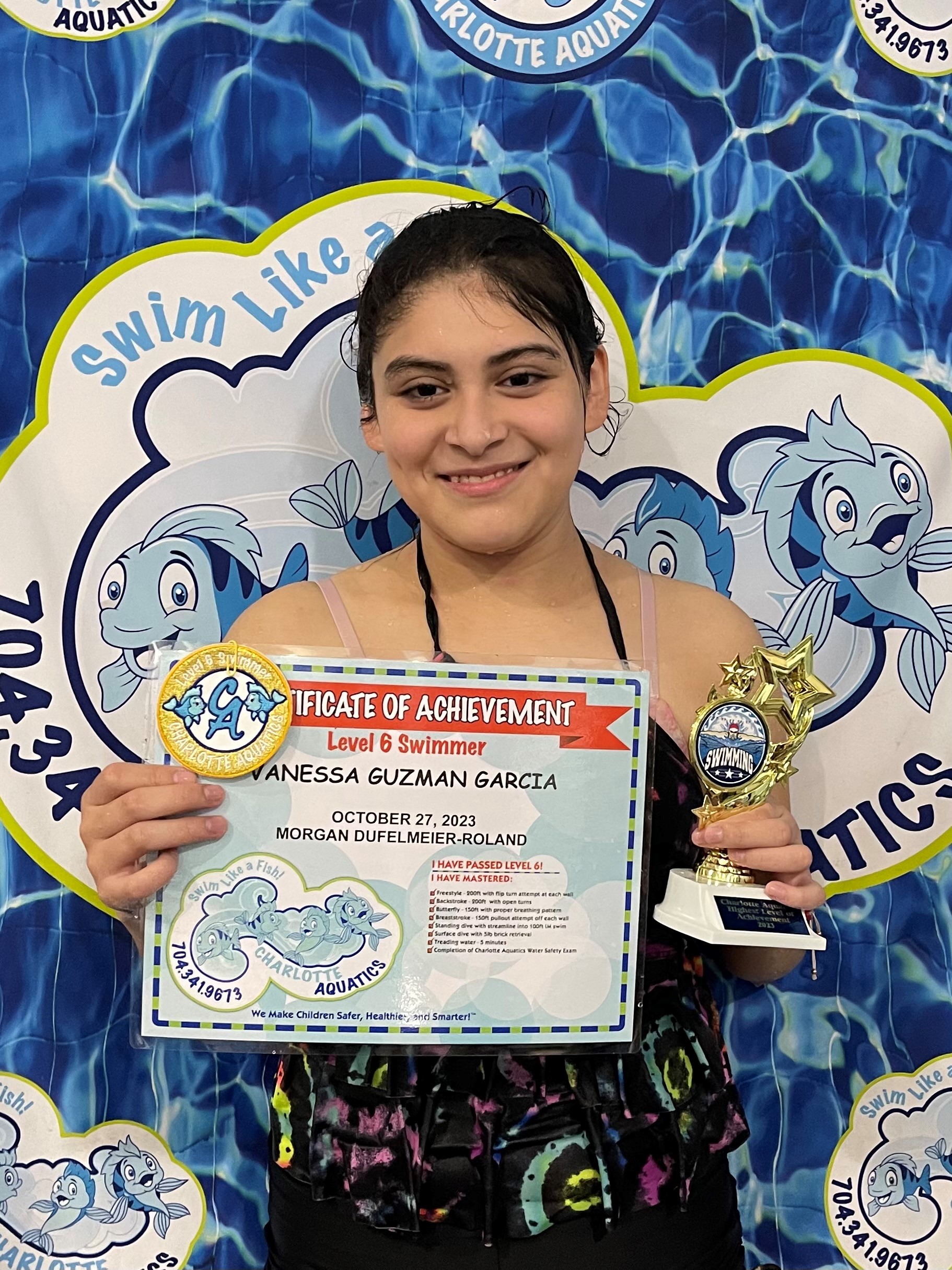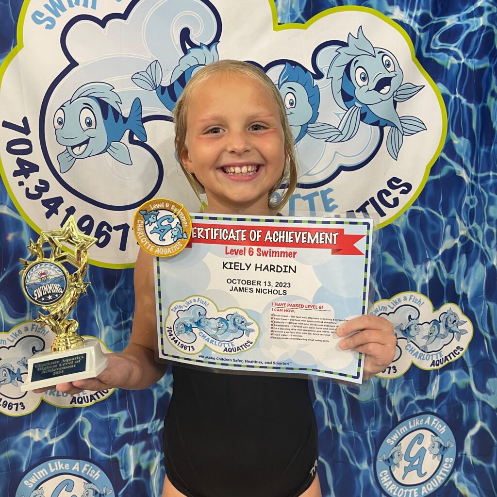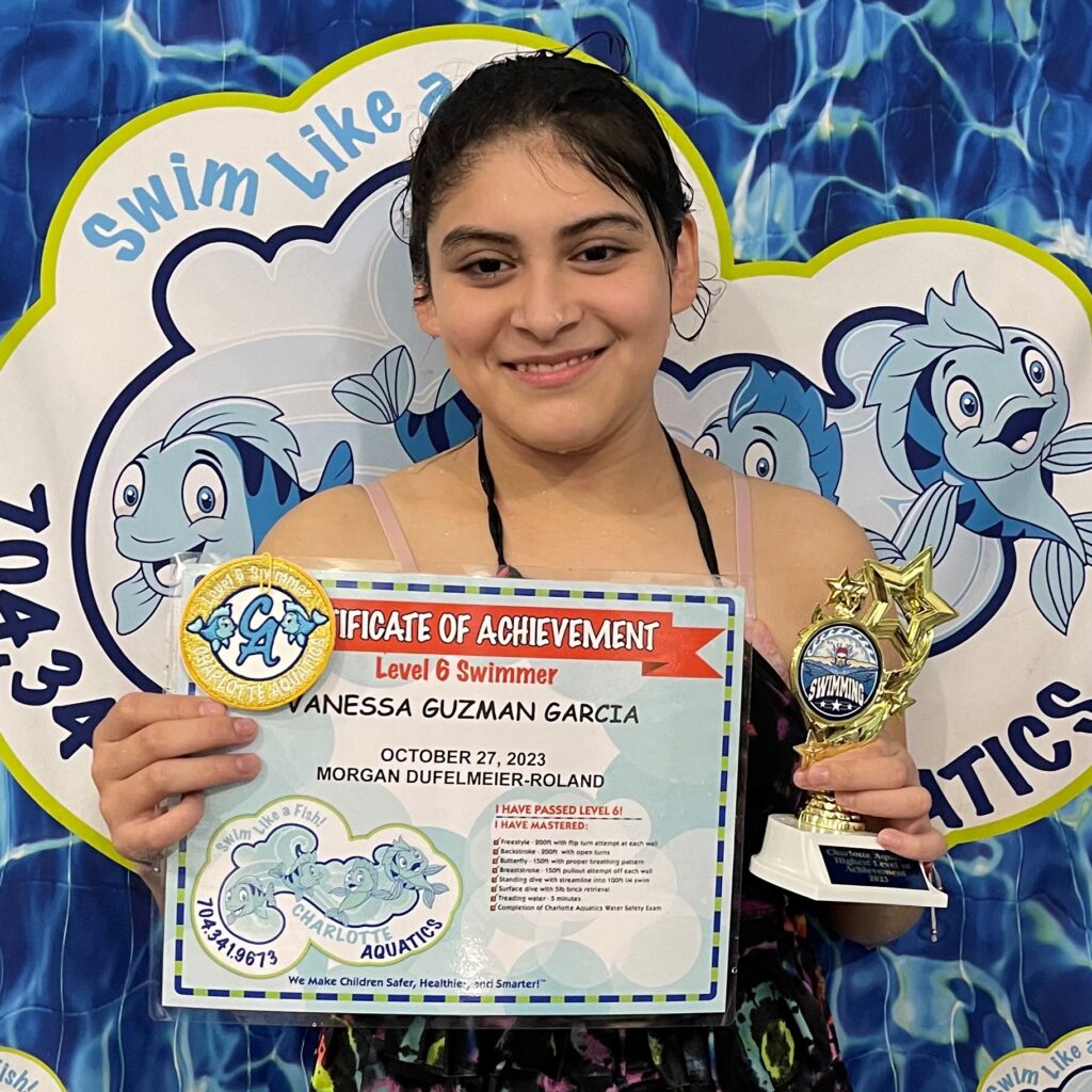 Outside of swimming she loves to read and crochet. She crochets to make items like hats, bookmarks to sell for donation to kids in treatment at Levine’s Children Cancer Hospital. One of her favorite swimming memories here is riding in the boat during safety week. She keeps all her certificates and patches in a folder. She enjoyed classes with all her teachers, especially her recent classes with Mr. William and Mr. Mike because they make her laugh and make swimming so much fun! She always wanted to graduate from Mr. Mike’s class because her older brother also graduated from his class and got the trophy. This trophy will be one of her prized possessions forever!