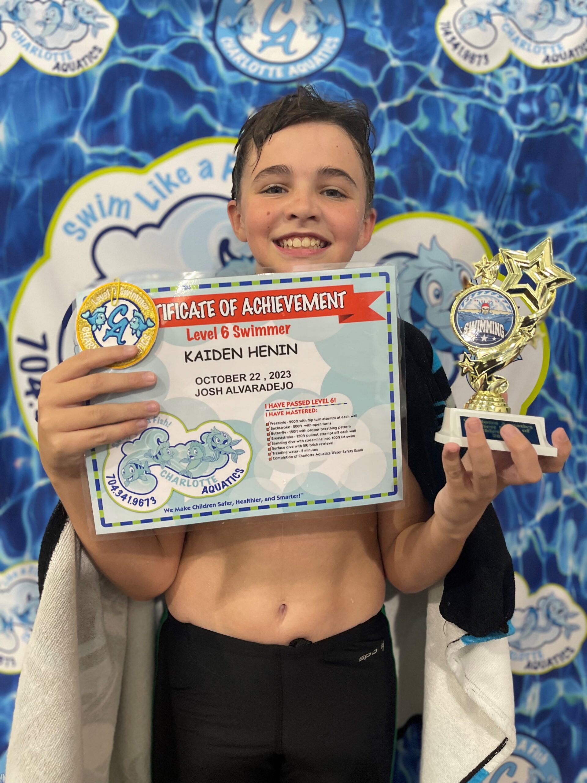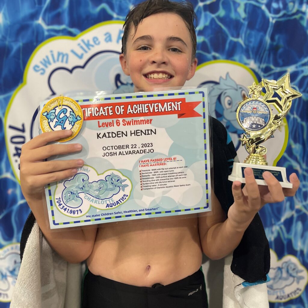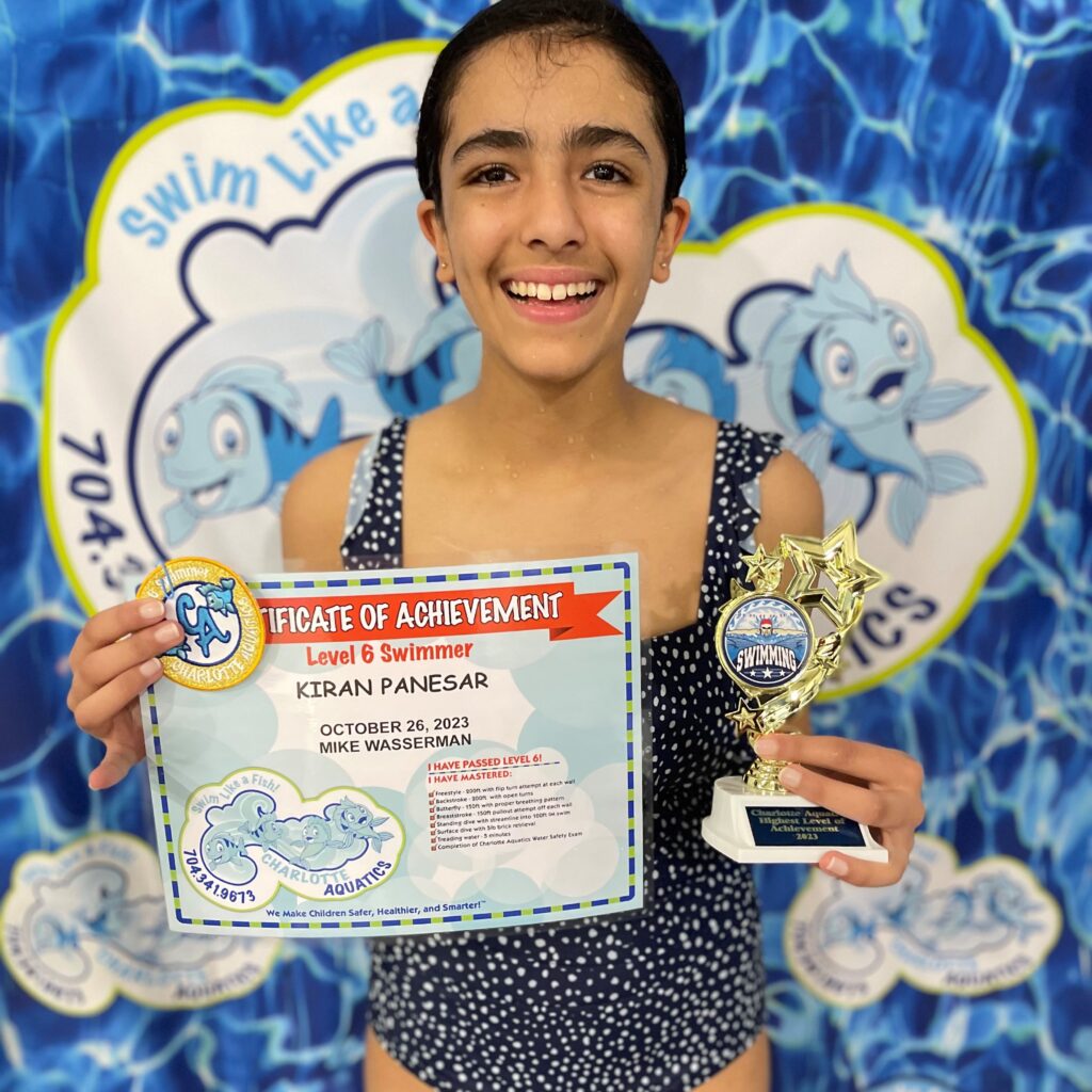Kiran is 12 years old, and she has been waiting for graduation day for a long time! She started learning swimming at Charlotte Aquatics in Summer of 2015. Late 2016 she was diagnosed with cancer and had to stop. She started again after her treatment in fall of 2018 and had to stop due to covid in Nov 2019. She did not give up and wanted to get back in the pool, which she did in the summer of 2022 last year. When she read her graduation email, she was ecstatic!!