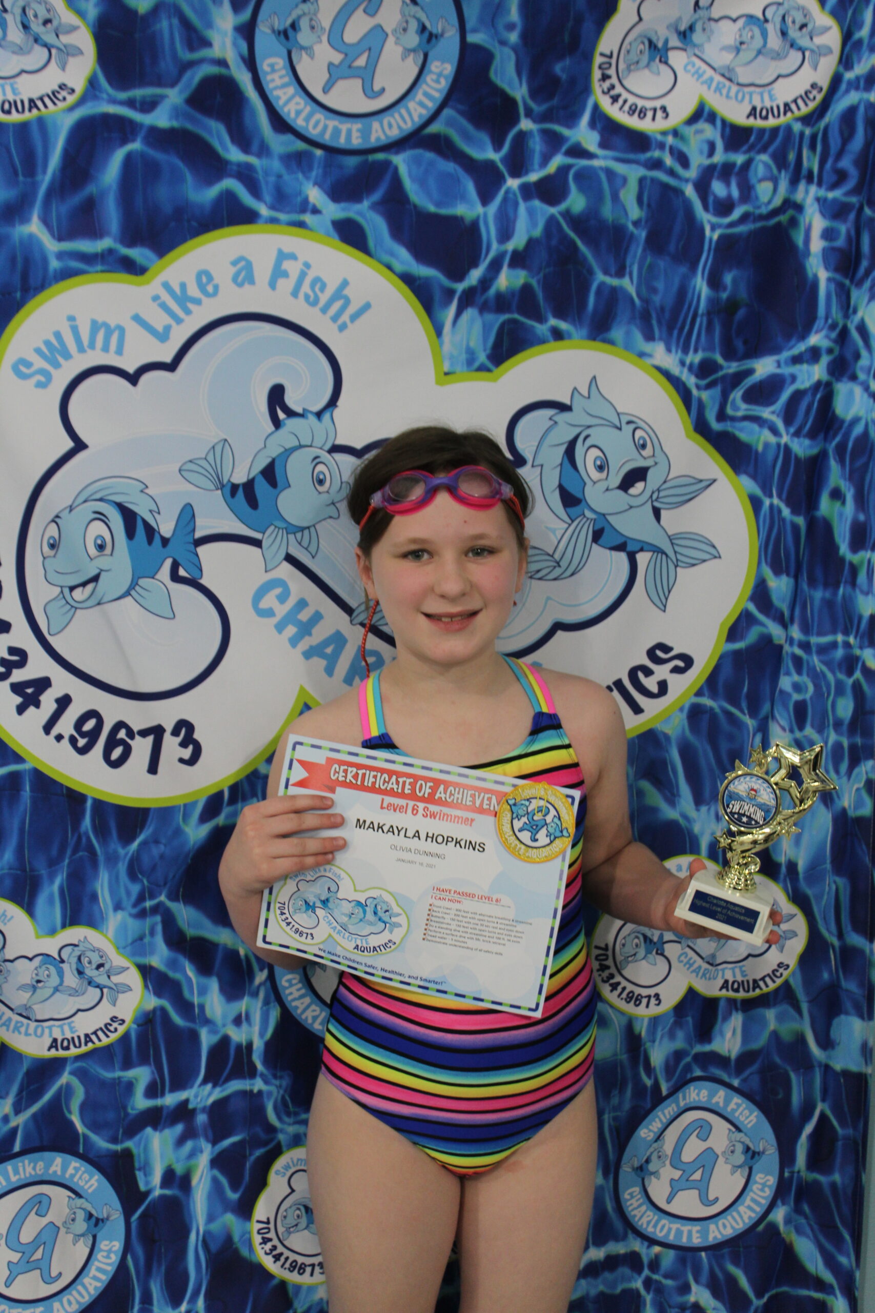 Hi! My name is Makayla Hopkins. I am 8.5 years old and in the 3rd grade. I have been swimming for six and ½ years. My favorite stroke is breaststroke. What I like best about Charlotte Aquatics is my swim teacher, Miss Olivia. When I am not swimming, I love doing art projects, making crafts, playing outside, and reading. I love Charlotte Aquatics!