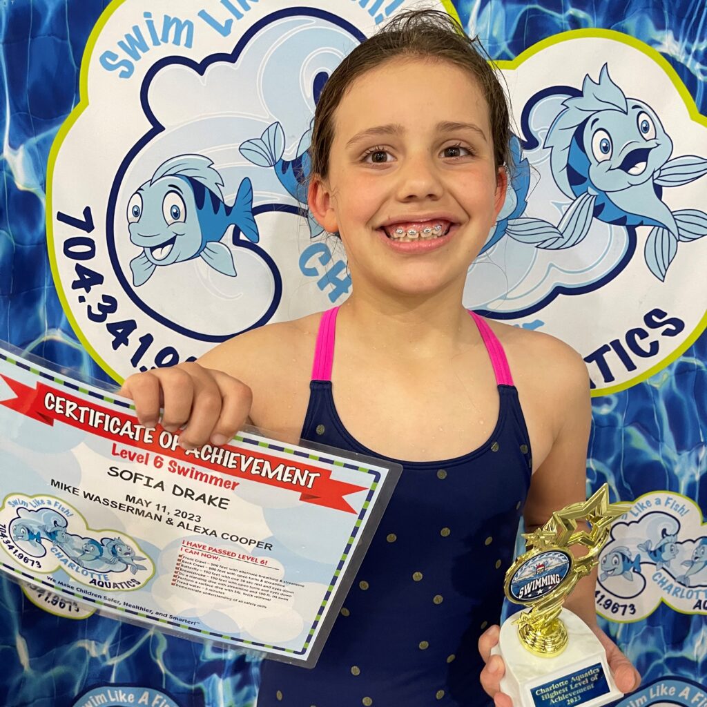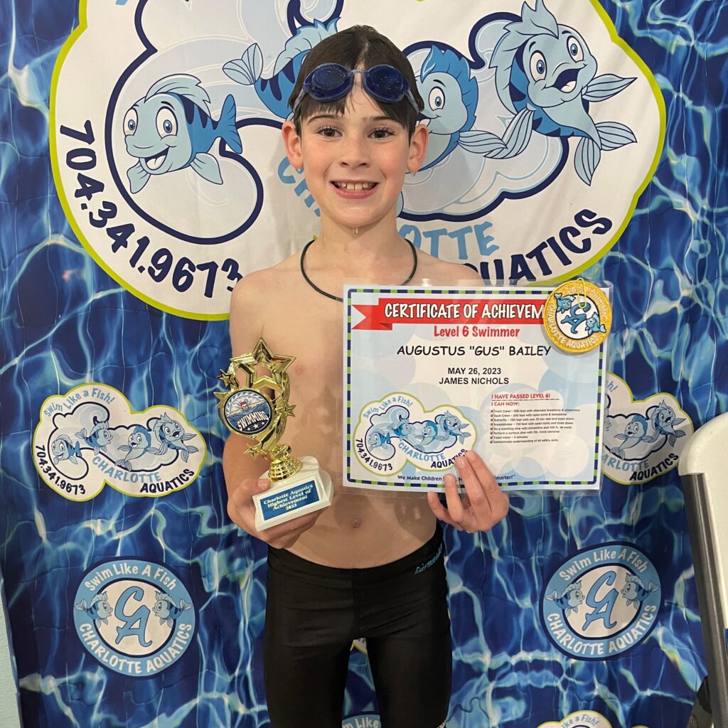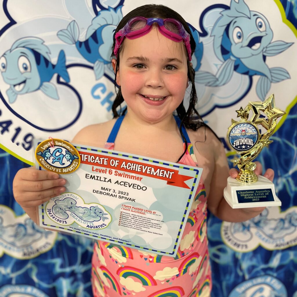 Emilia is 7 yo and just finished 1st grade. With an exception of a small break, she has been in the pool at Charlotte Aquatics since she was 6 months old. She loves swimming, and she cannot go very long without getting in the water. It has helped her be safer around the pool and is her favorite sport. Her favorite stroke is the breaststroke, though she really enjoys it when she can bob from one end of the pool to the other! One of her favorite memories was when she was learning water safety and had to swim with her clothes on. “It’s fun to be able to say I know what it feels like!”