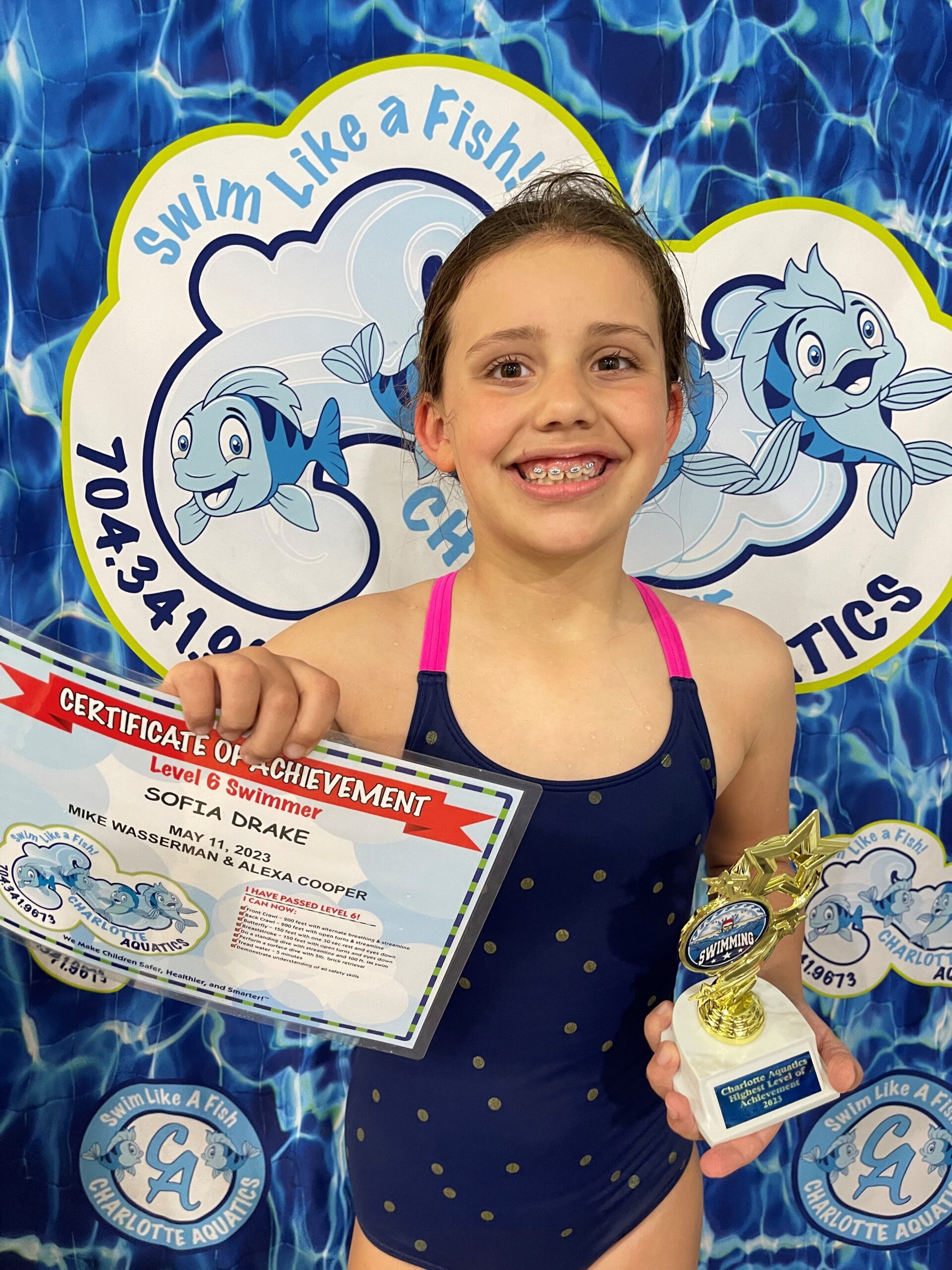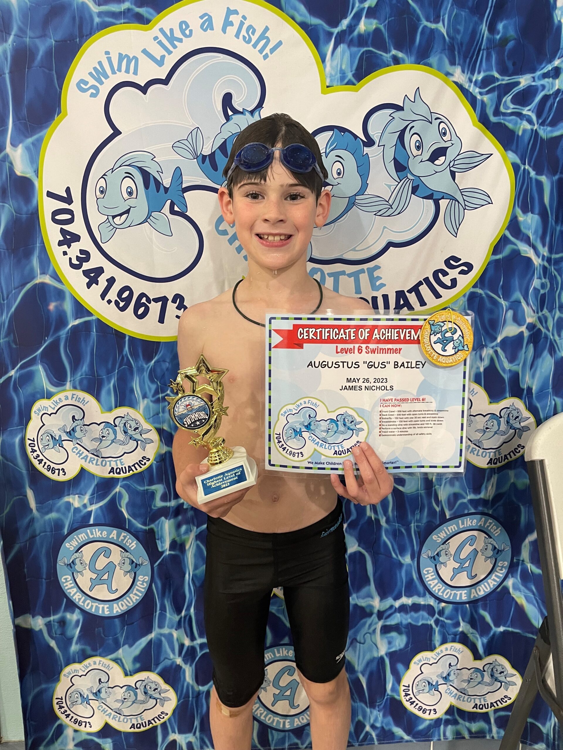 Emilia is 7 yo and just finished 1st grade. With an exception of a small break, she has been in the pool at Charlotte Aquatics since she was 6 months old. She loves swimming, and she cannot go very long without getting in the water. It has helped her be safer around the pool and is her favorite sport. Her favorite stroke is the breaststroke, though she really enjoys it when she can bob from one end of the pool to the other! One of her favorite memories was when she was learning water safety and had to swim with her clothes on. “It’s fun to be able to say I know what it feels like!”
