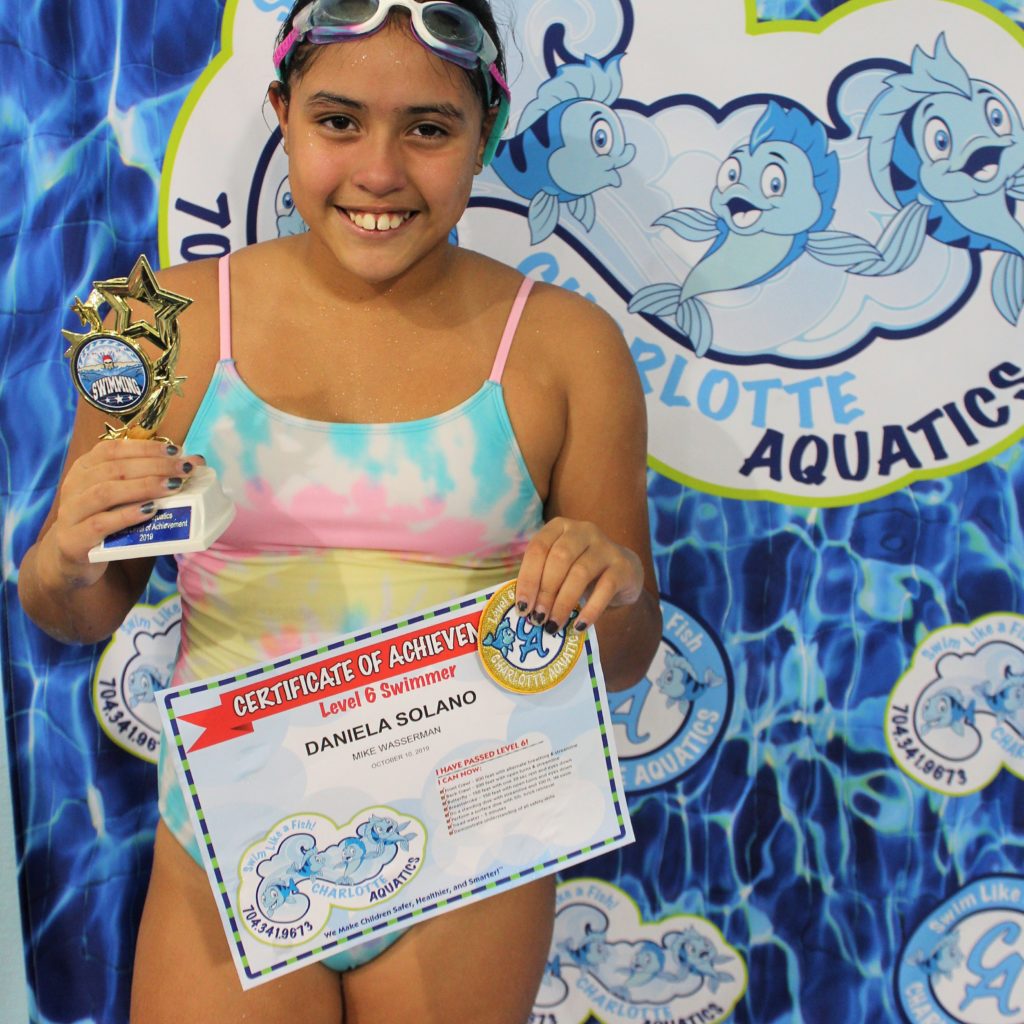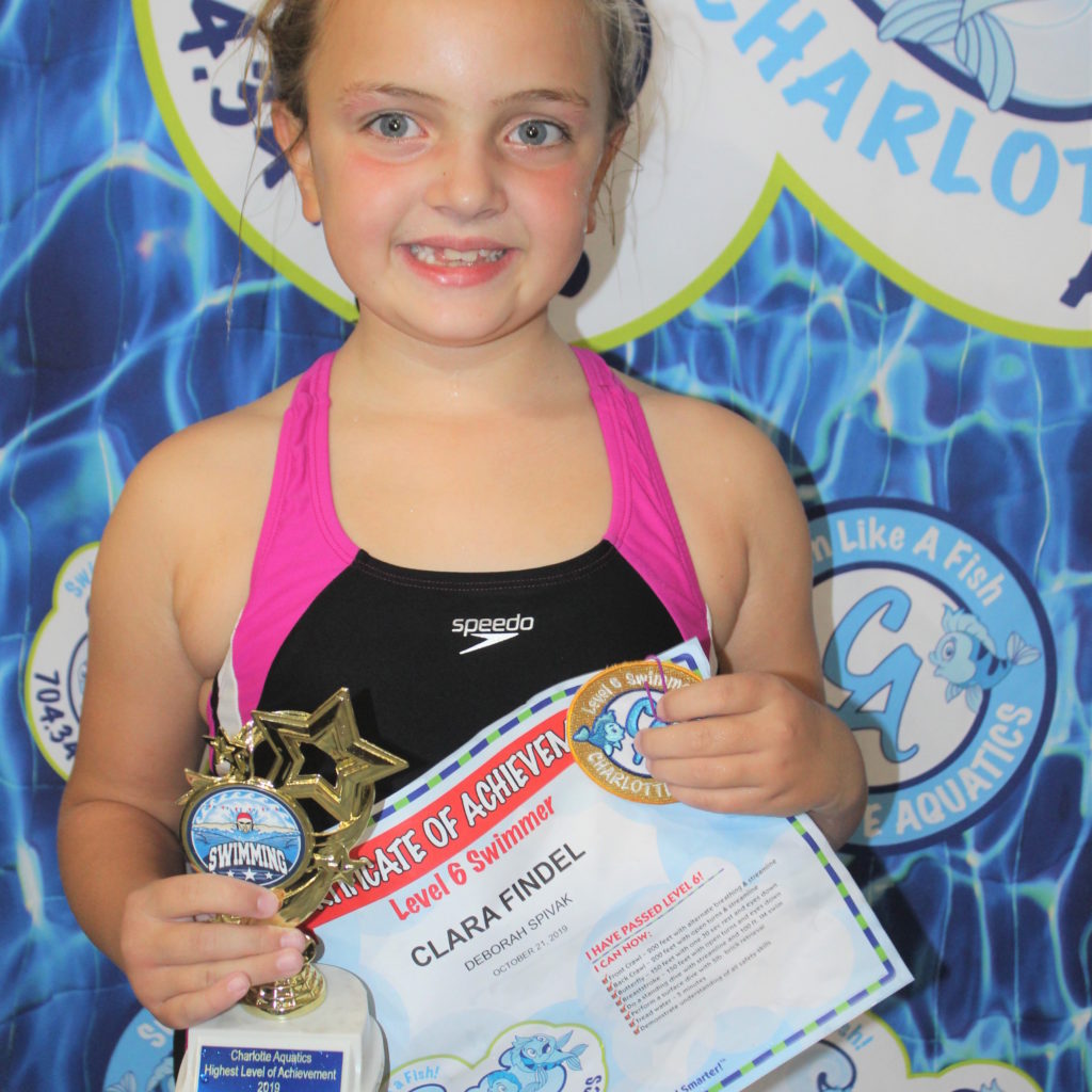 My name is Clara. I’m 7 years old and in second grade. I love swimming and when I’m not in the water I like playing the piano, playing with my friends and drawing. It was so great for me being able to swim by myself for the first time without being afraid and when I got a patch when I passed the level for the first time. I collected all my patches in my room. My favorite stroke is breaststroke, the last stroke I learned. I was totally afraid of the water before I was able to swim. It was such a great experience to become friends with the water. Since then my mom cannot get me out of the water and my favorite animal is a dolphin. The teachers of Charlotte Aquatics are all so nice, patient, and taught me a lot in an awesome way. I will never forget the amazing teachers and the rope swinging into the water. Thank you so much for such a great time.
