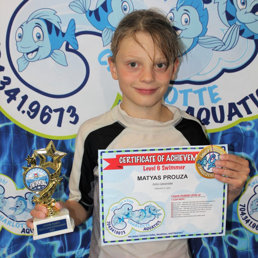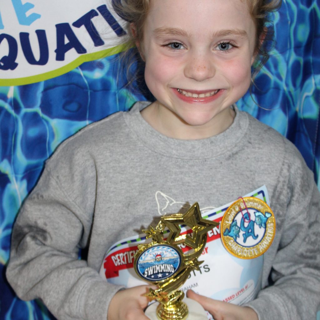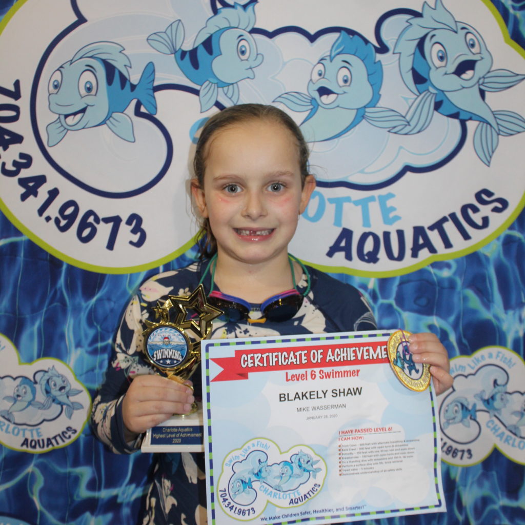 My name is Blakely and I am in the first grade. I have been at Charlotte Aquatics since I was a baby. My big brother passed level 6 and I wanted to pass it, too! When I am not swimming, I like to play on my gymnastics bar. My favorite swimming memory is when I pushed Mr. Mike into the swimming pool! I like collecting the swim patches and I display them on my memory board in my bedroom. Front crawl is my favorite stroke–some people call it “freestyle.” It makes me feel good to be in the water and now that I have graduated from Level 6, I can swim to the floating dock at the lake by myself. I like Charlotte Aquatics because the teachers are all nice and it’s fun to swim in the pool. Using the rope at the end of swim class is my favorite thing to do at Charlotte Aquatics!