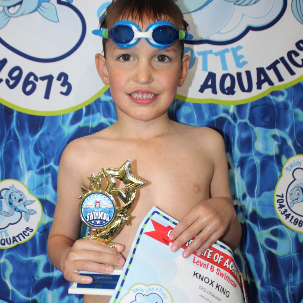 Knox is a six-year-old kindergarten student who has been with Charlotte Aquatics since he was six months old. When Knox isn’t swimming, he loves playing at the playground, baseball, tennis, golf, and, of course, LEGOS! Knox’s favorite swimming memory is snorkeling in St. Martin and watching sea turtles. His favorite stroke is breaststroke. He says swimming has changed his life by giving him the opportunity to compete on swim teams and to jump off big diving boards and extra tall docks. His favorite things about Charlotte Aquatics are the rope swing and Ms. Gigi. Knox’s favorite memory of Charlotte Aquatics was moving up to level 6, but now we suspect it will be graduating!