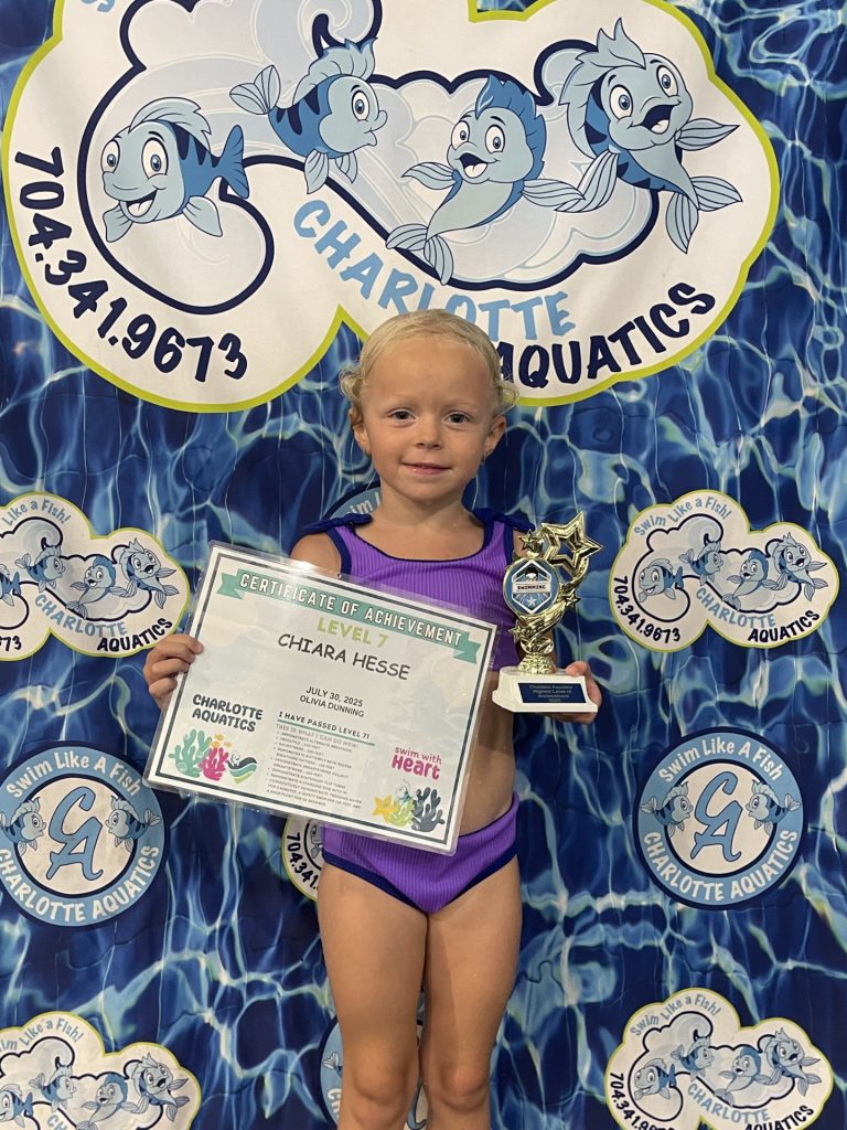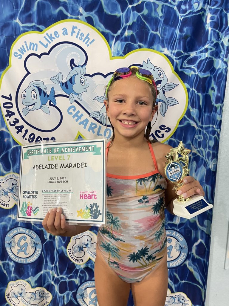 Welcome, Charlotte Aquatics family and proud parents, to a special edition of our swim blog that is sure to make waves of excitement! Today, we are thrilled to shine a spotlight on the rising stars of our aquatic community – the newest Level 7 Graduates! Our graduates are ready to share their tales – inspiring bios that showcase the transformation that happens when passion meets persistence in the shimmering embrace of the water.