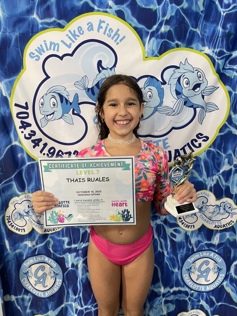 Swimming has changed Thais’ life because it has helped her feel safe and confident in the water. What she loves most about Charlotte Aquatics is her coaches. One of her favorite memories is getting her picture taken every time she passed a level.