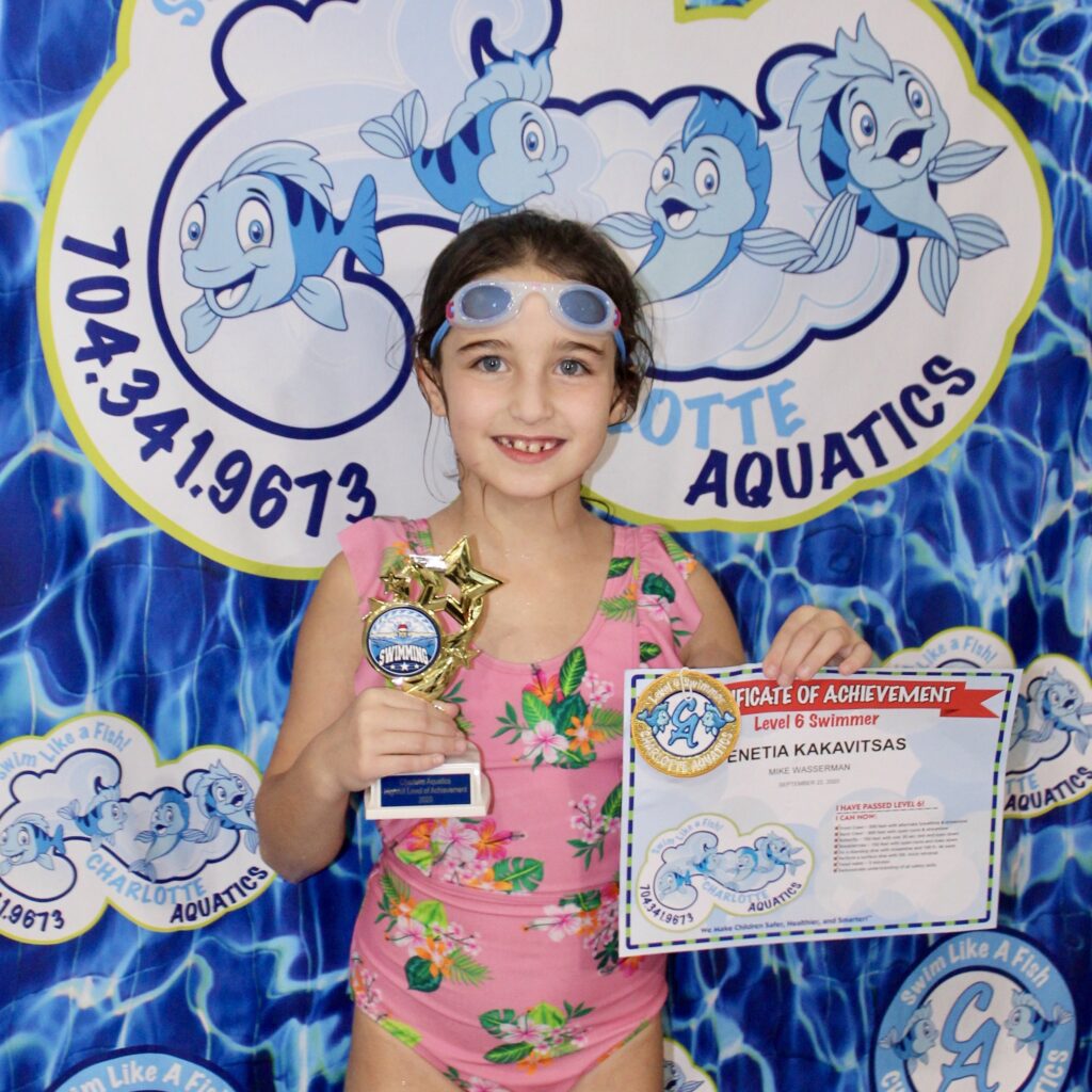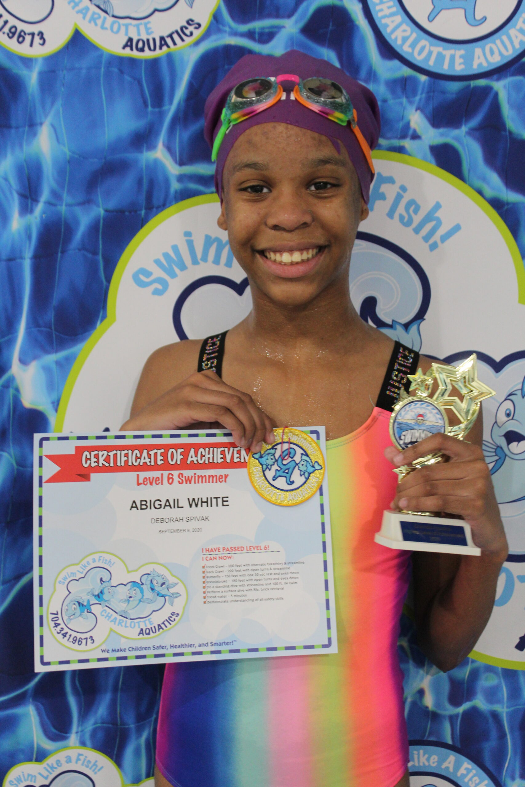 Parent Note: Abigail has learned so much during her time at Charlotte Aquatics. Watching not only her water techniques grow but her confidence grow as well, has been remarkable! Each and every instructor she has had, has been patient and encouraging, which has helped her thrive! The staff here at Charlotte Aquatics is nothing short of AMAZING, and we have been so happy here! -Amber White